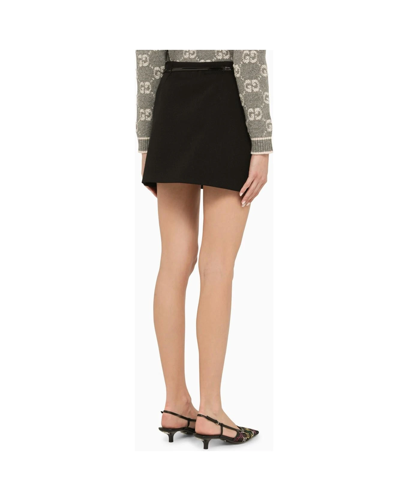 Gucci’s black cotton mini-skirt, featuring a front slit and a metal clamp at the waist.