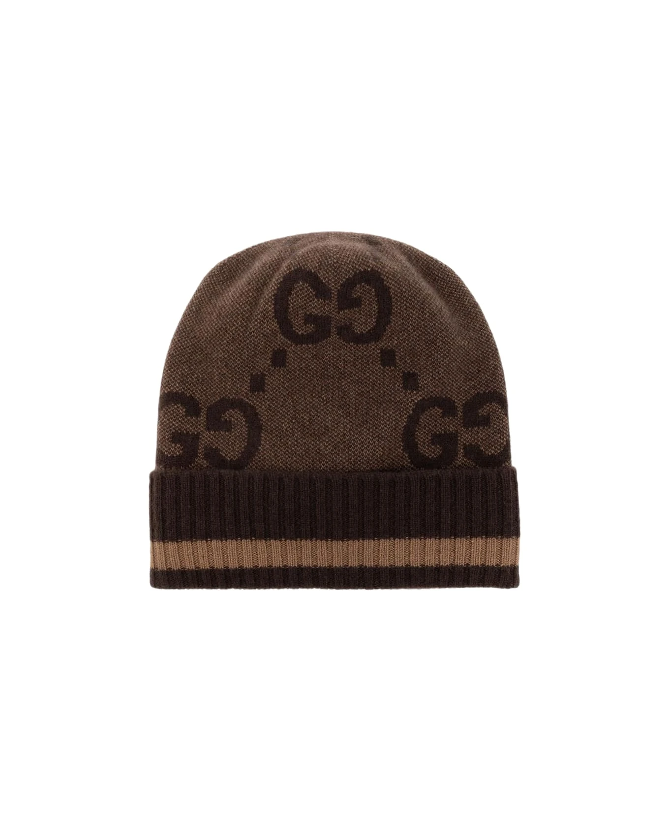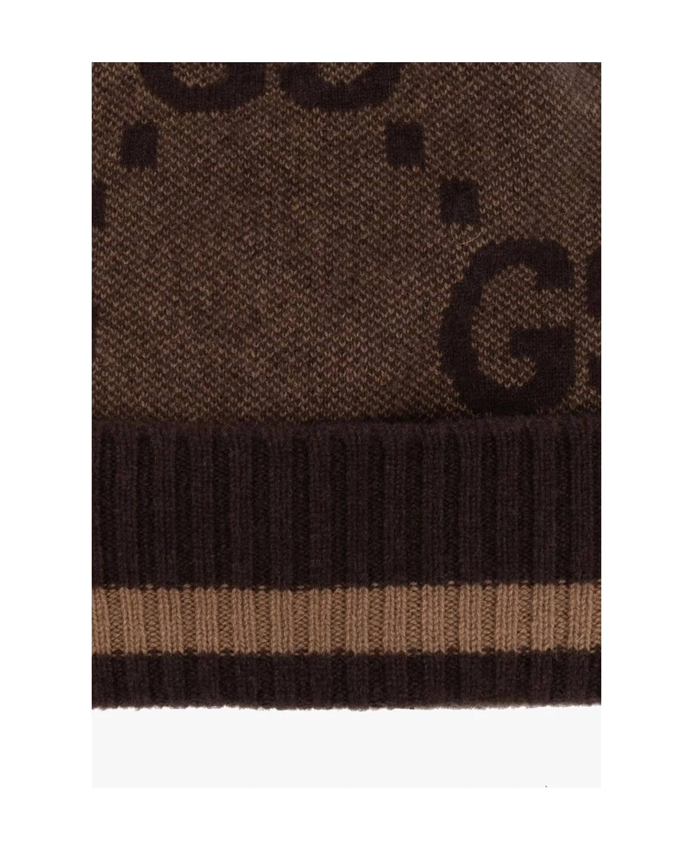 Brown beanie from Gucci. Made of cashmere, this item showcases a monogram pattern and a striped rib-knit brim.