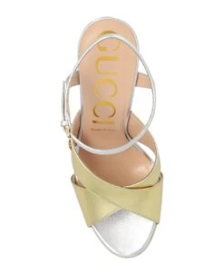 Gold-tone and silver-tone heeled sandals from Gucci. Made of leather, this model sits on a cream leather sole and features a buckle ankle strap and antiqued gold-tone logo hardware.