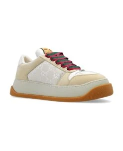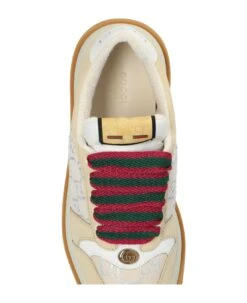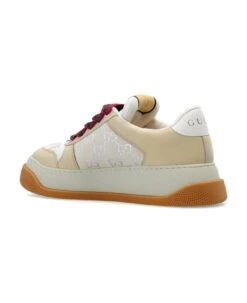 Beige and cream lace-up sneakers from Gucci. Made of suede trimmed with GG Original canvas, this pair features an antiqued gold-tone logo detail on the front, logo patch on the tongue, gold-tone logo print at the back, shoelaces with the signature Web str