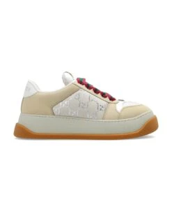 Beige and cream lace-up sneakers from Gucci. Made of suede trimmed with GG Original canvas, this pair features an antiqued gold-tone logo detail on the front, logo patch on the tongue, gold-tone logo print at the back, shoelaces with the signature Web str