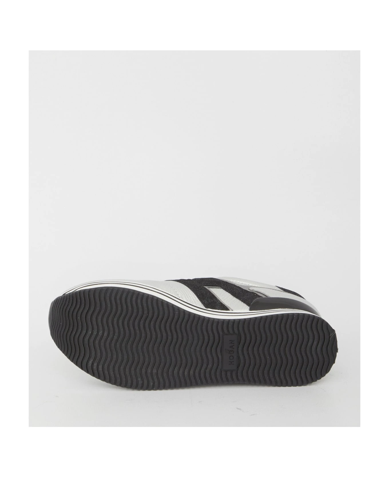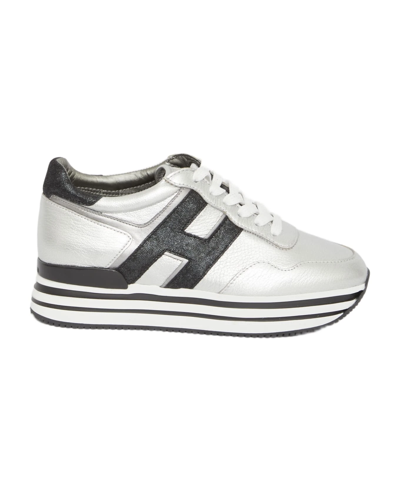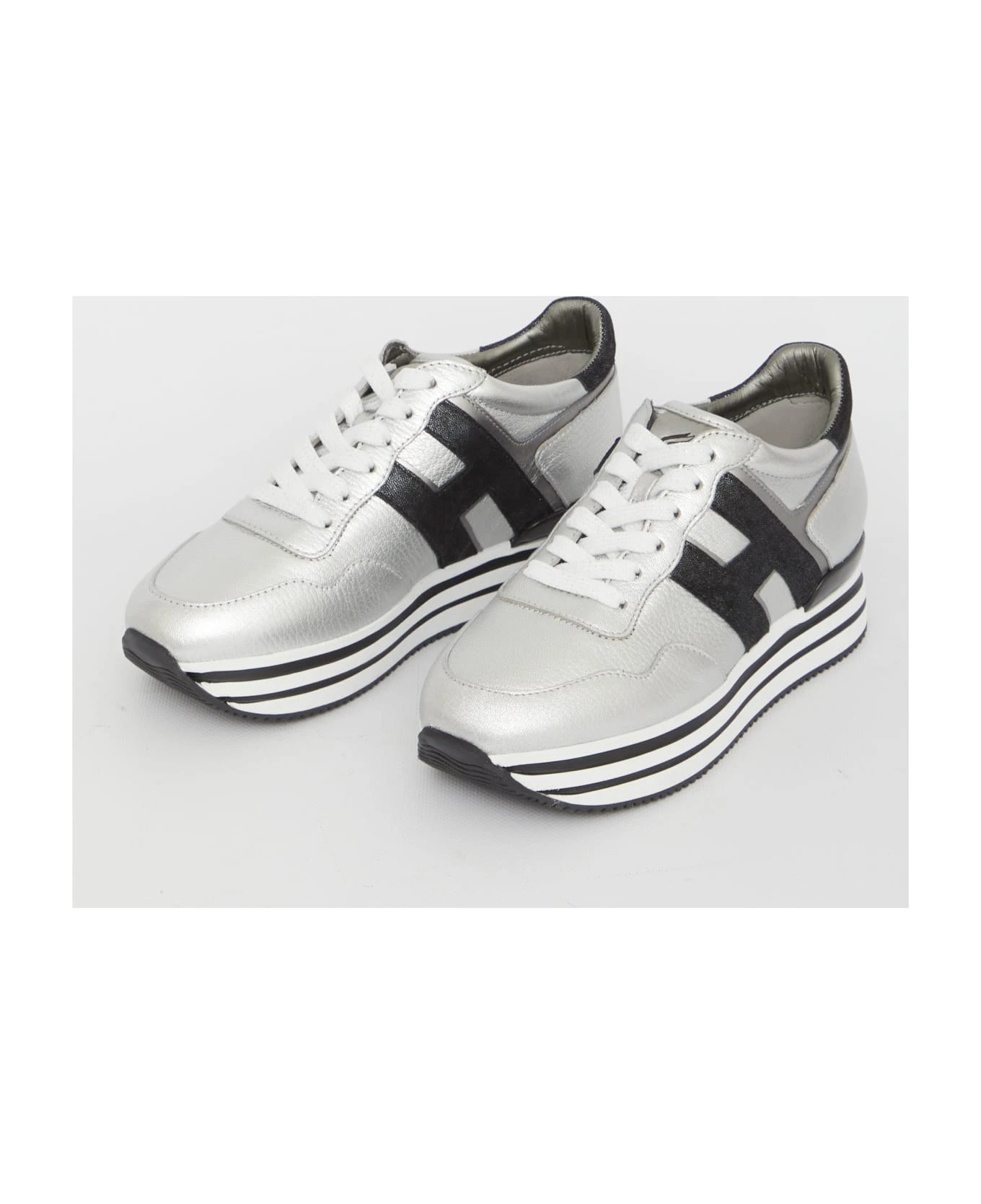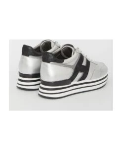 Midi Platform sneakers in silver and black leather with laminated details. They feature lace-up closure, patent leather side H, removable insole 8mm and ultralight EVA outsole. Embossed Hogan logo on the back.