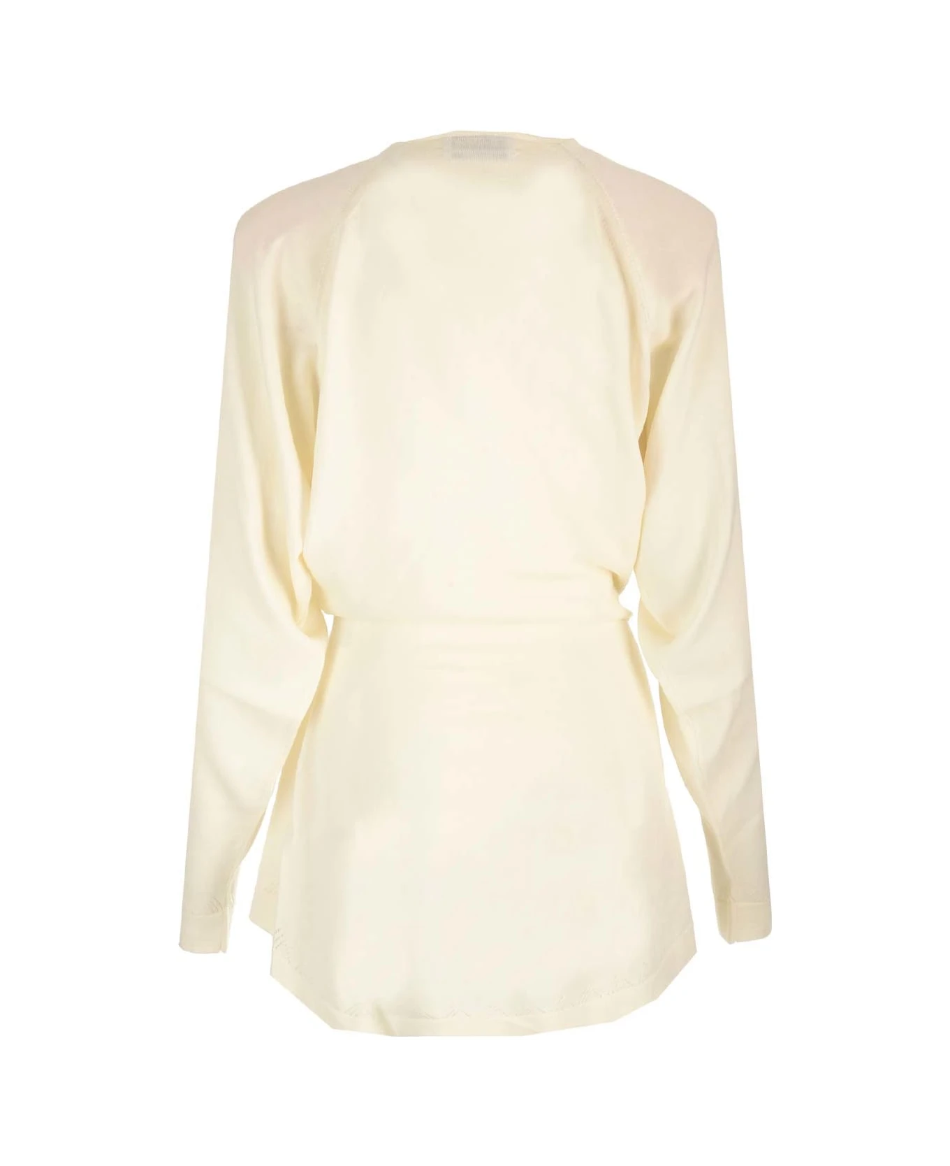 Ivory “Hurely” mini dress from The Attico in wool, long sleeves, side silver O-ring closure, V-neck.