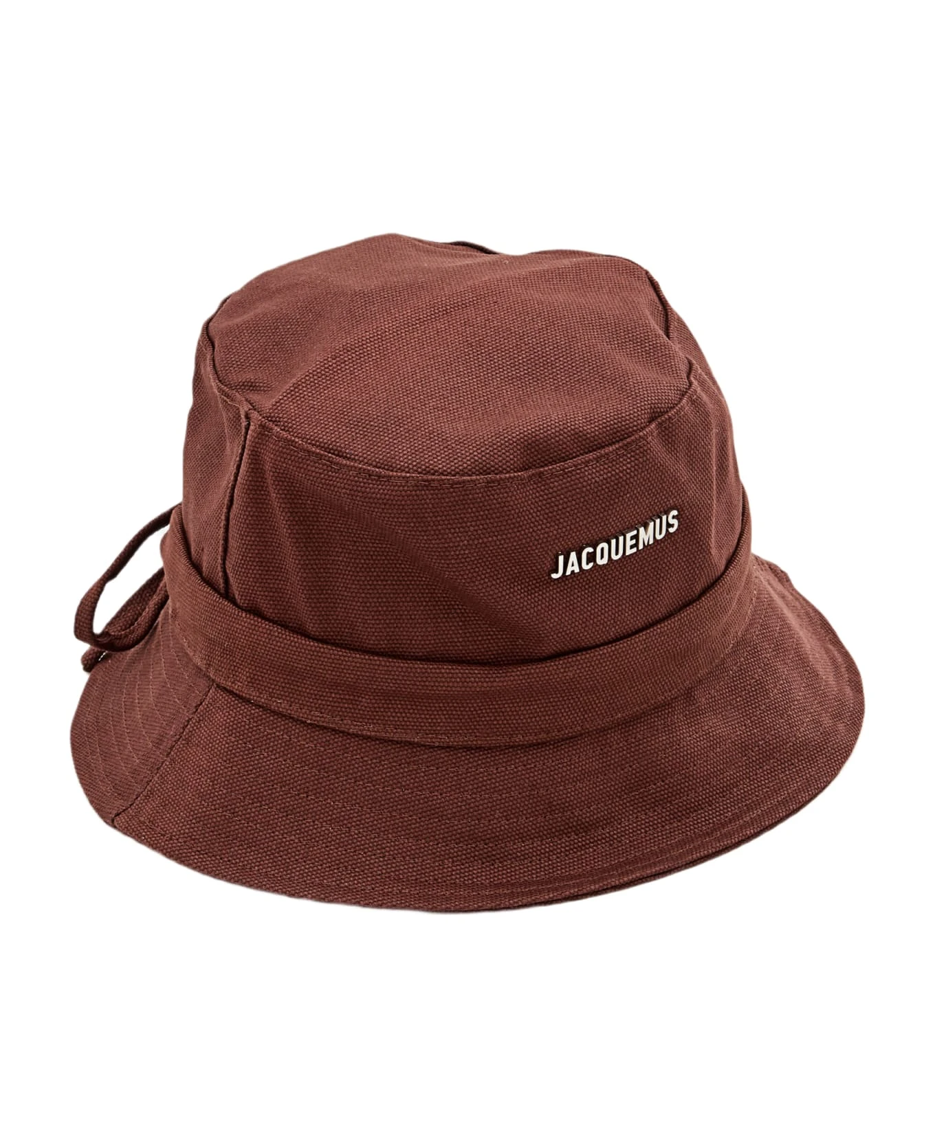 Cotton bucket hat. Silver metal logo. Visible topstitched drawcord in the back that can be tied in a bow. Topstitched brim. Color: brown.