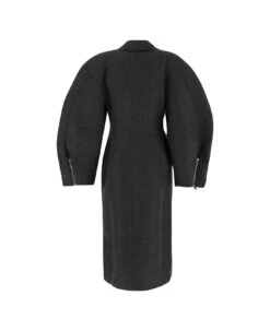 Jacquemus coat in dark grey polyester blend with round raglan sleeves, concealed zip closure, pointed collar, fitted shape, zipped cuffs, below-the-knee length, slanted zipped pockets and waist fastening.