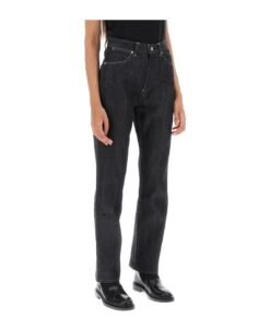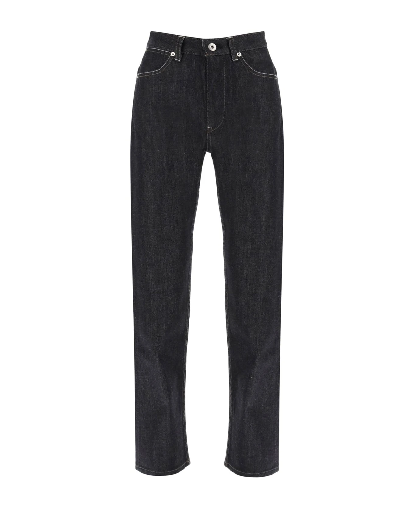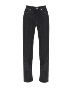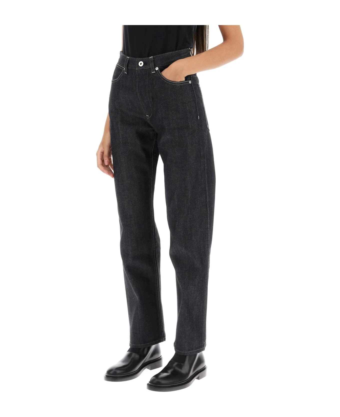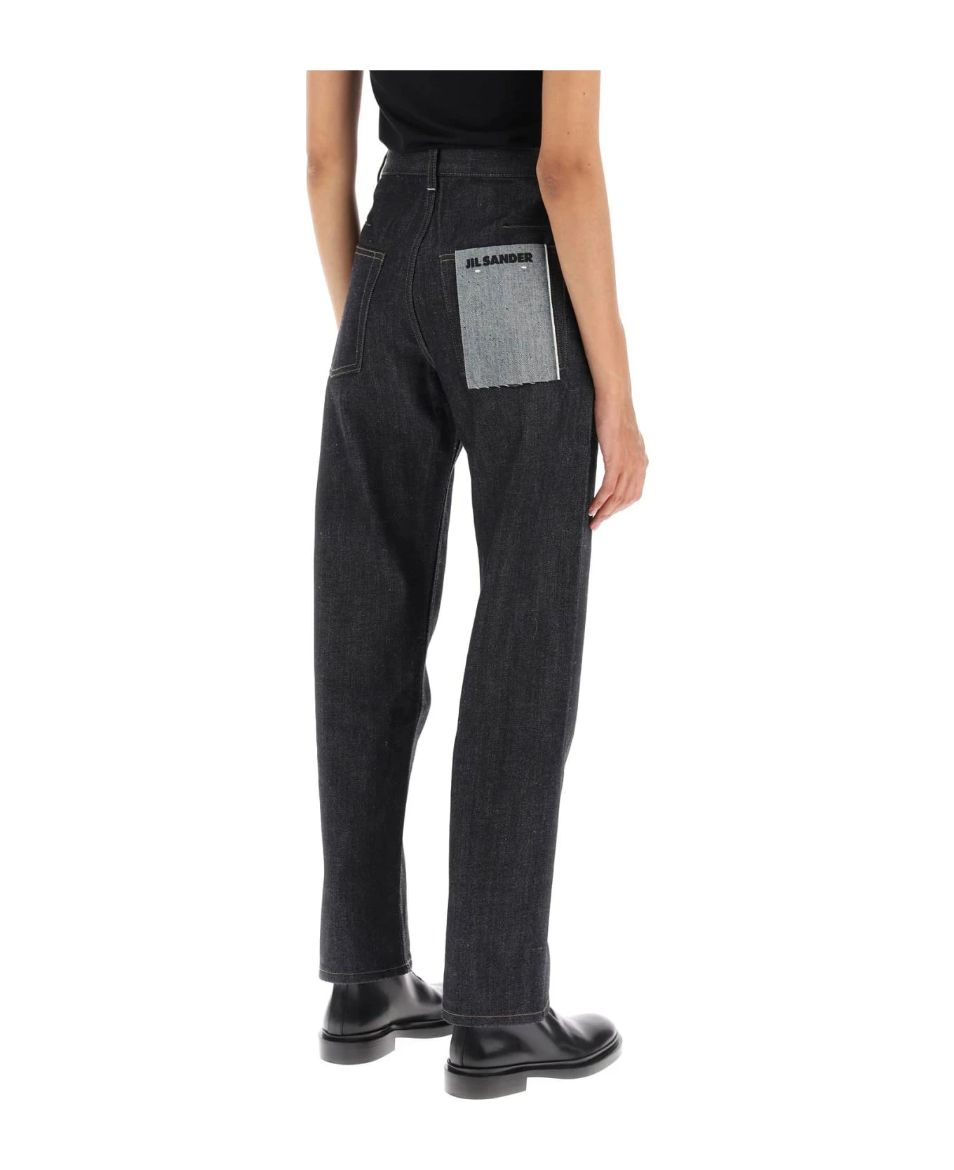 Jil Sander straight-leg jeans made from raw denim. Five-pocket style featuring belt loops at the mid-rise waist, zip fly with button, and contrast stitching. The model is 177 cm tall and wears a size 26.