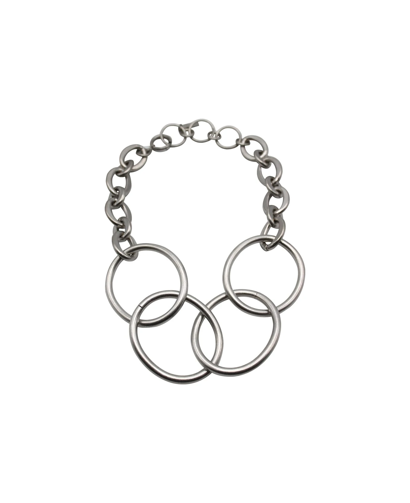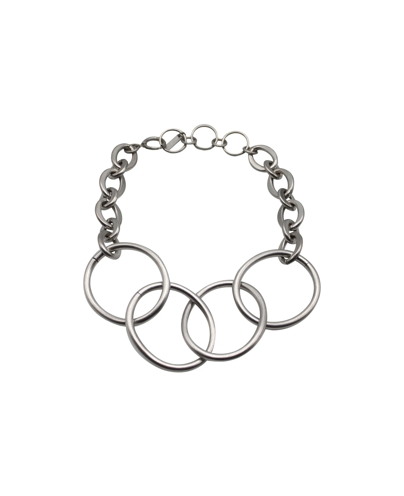 Junya Watanabe four ring chain link necklace in silver tone with charm logo and adjustable fit