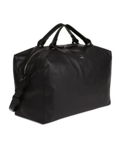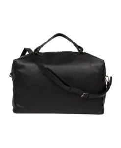 Black Smooth cowhide leather travel bag, textile lining, zipped closure, ajustable and removable leather shoulder strap, a zipped pocket, two patch pockets, 48 x 30 x 22. 5 cm