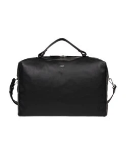 Black Smooth cowhide leather travel bag, textile lining, zipped closure, ajustable and removable leather shoulder strap, a zipped pocket, two patch pockets, 48 x 30 x 22. 5 cm