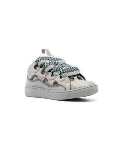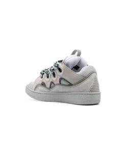 Grey Curb sneakers for women by Lanvin crafted from nappa calfskin, suede and mesh and featuring a round toe, a rubber sole and a lace-up design with double herringbone-waxed and woven laces. Quilted tongue with Lanvin label and embossed Mother and Child logo. This elaborately constructed shoe stands out for its extraordinary comfort thanks to its rounded shape, padded tongue and metal eyelets. A 90s-inspired model with a bold design and exaggerated dimensions.