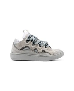 Grey Curb sneakers for women by Lanvin crafted from nappa calfskin, suede and mesh and featuring a round toe, a rubber sole and a lace-up design with double herringbone-waxed and woven laces. Quilted tongue with Lanvin label and embossed Mother and Child logo. This elaborately constructed shoe stands out for its extraordinary comfort thanks to its rounded shape, padded tongue and metal eyelets. A 90s-inspired model with a bold design and exaggerated dimensions.