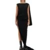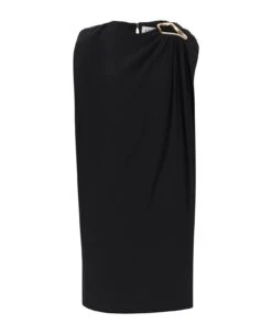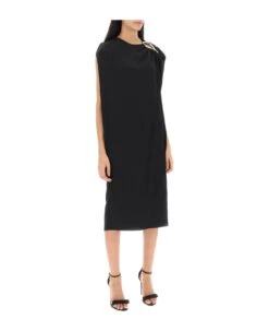 Sleeveless midi dress by Lanvin crafted in techno charmeuse, with draped design embellished with the signature gold-tone metal eyelet on the shoulder. It features upper-back closure with keyhole motif, side seam pockets and a slit on the side. Provided with built-in slip. Loose fit with straight cut. The model is 177 cm tall and wears size FR 36.