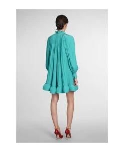 Dress in green polyester, ruffles, ruffle neck, long sleeves, pleated design, 100% polyester, Made in Slovakia, Model is 180 cm and wears 36