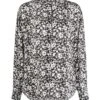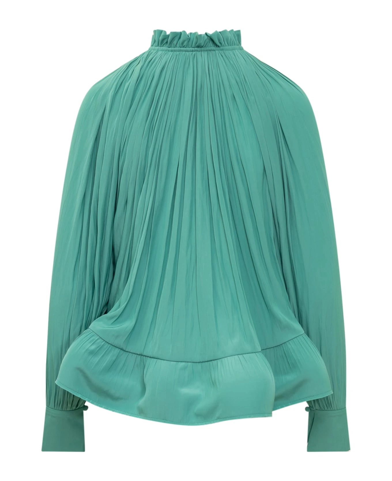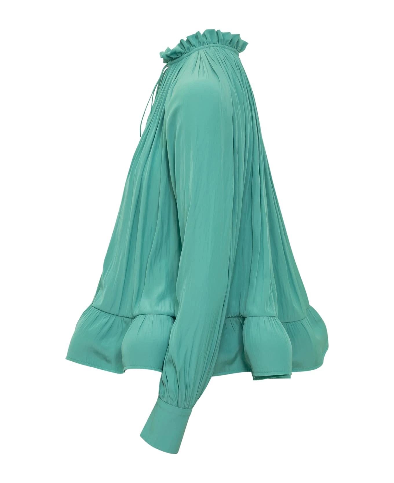 Long-sleeved blouse. Crew neck with ties. V-neck. Button cuffs. Applied charmeuse ruffles.