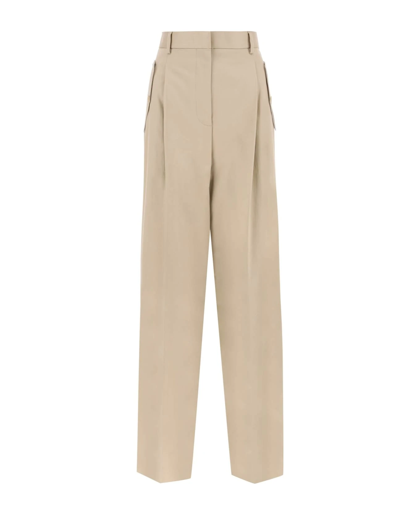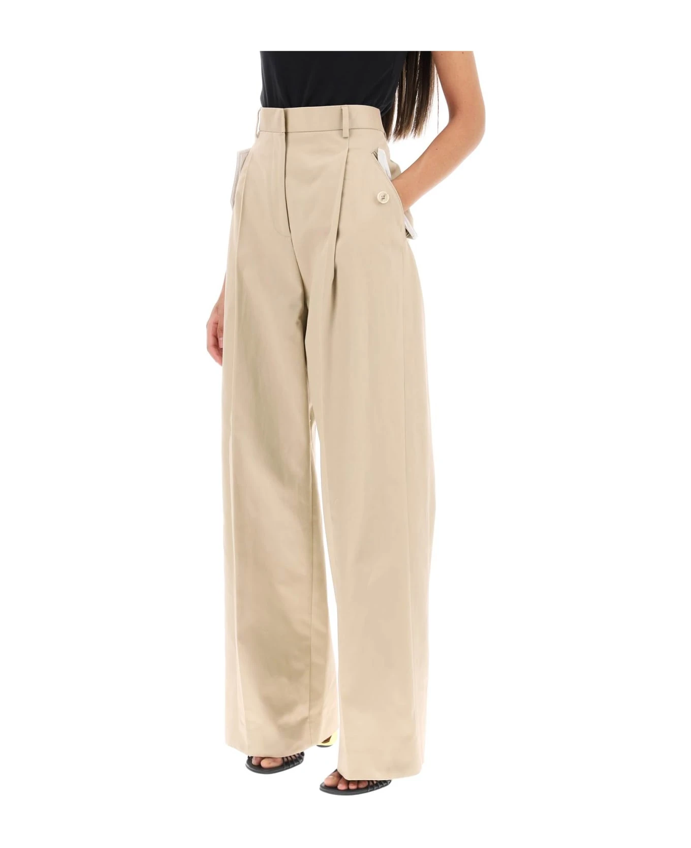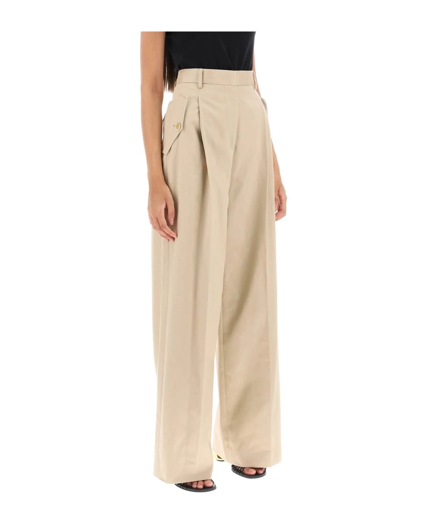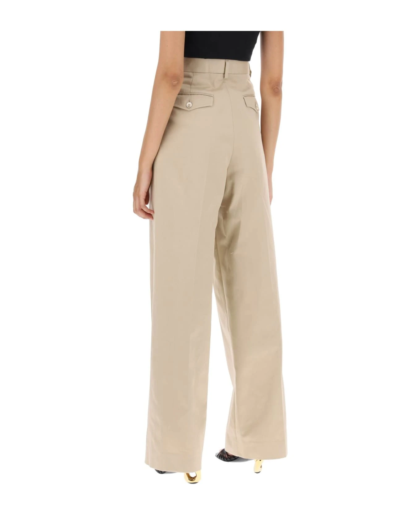 Lanvin wide-leg pants made from cotton gabardine with a single pleat front. They sit high on the waist and feature belt loops, four pockets with buttoned flap, and a zip fly with concealed hooks. The model is 177 cm tall and wears a size FR 36.