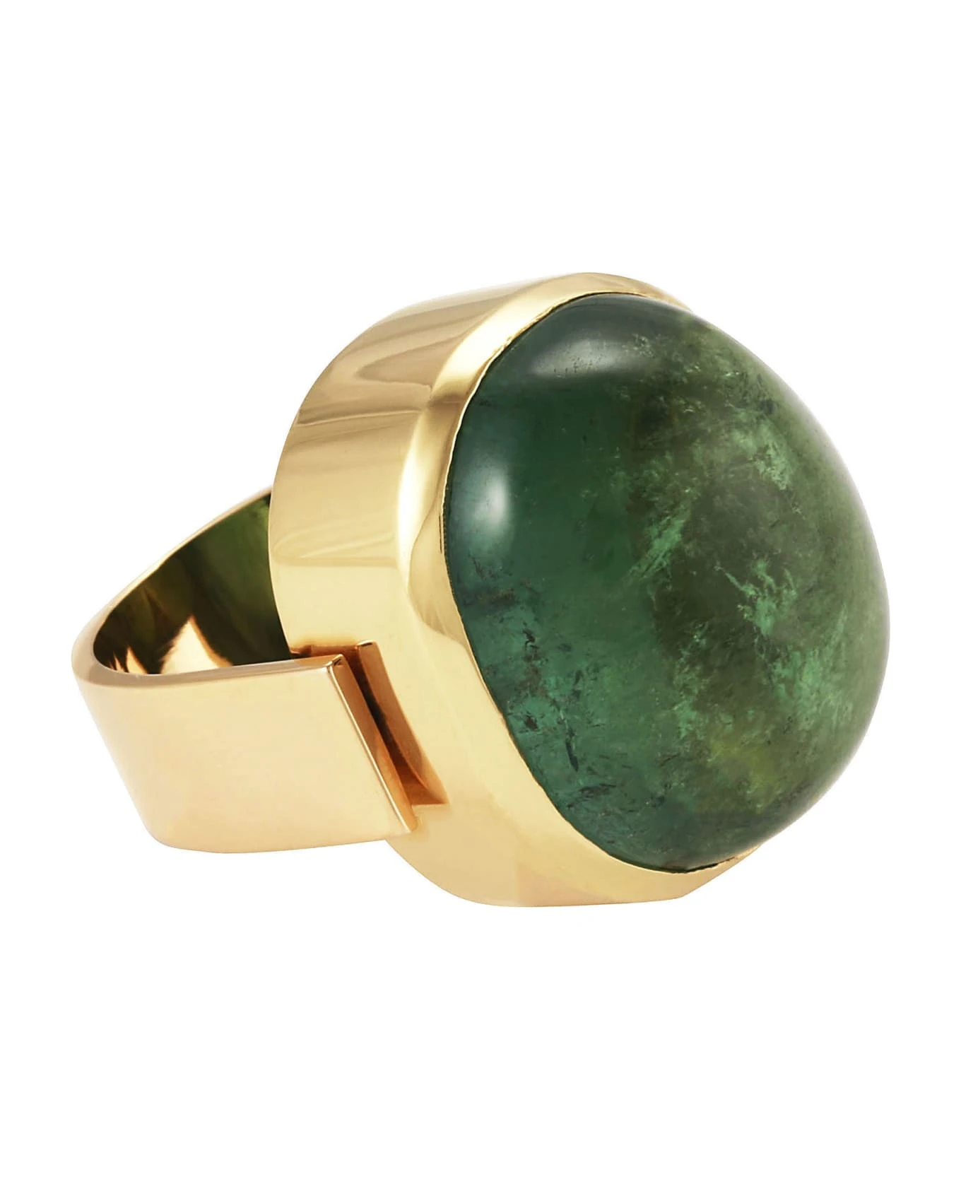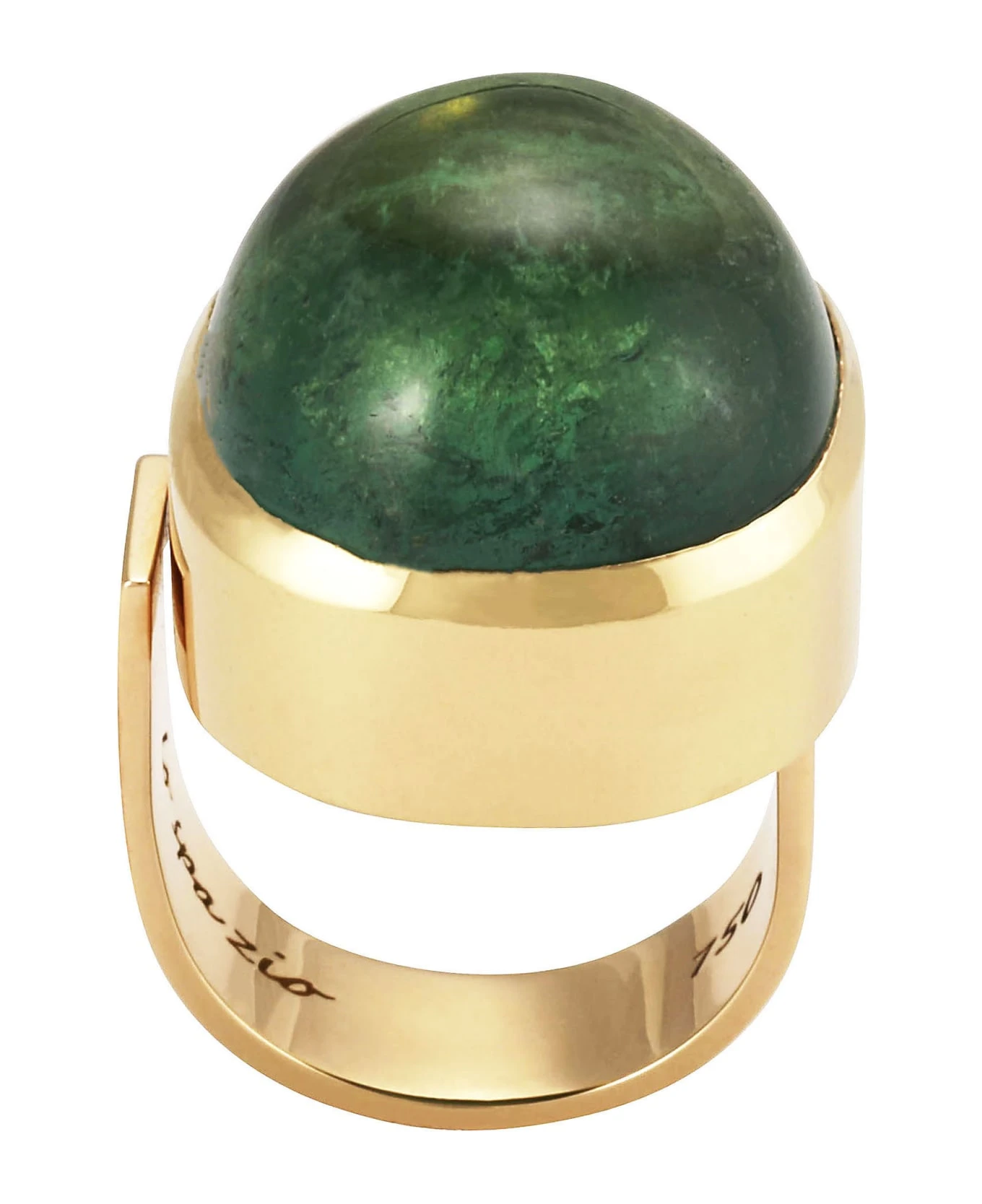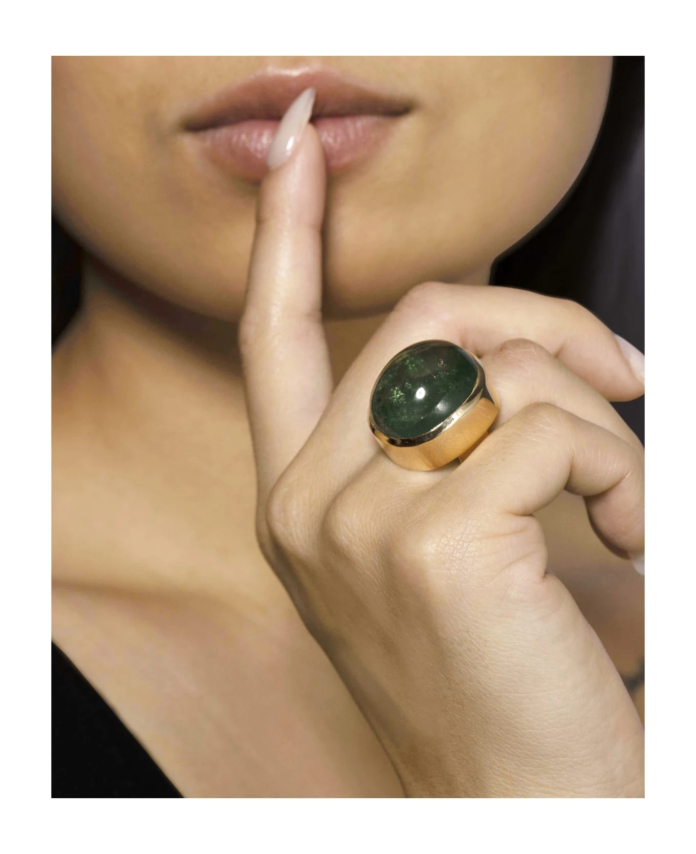 Gemstone measures: oval cabochon green Tourmaline measures 18.50 cm x 22 cm x 9 mm; approximately 45 ct. t.w.