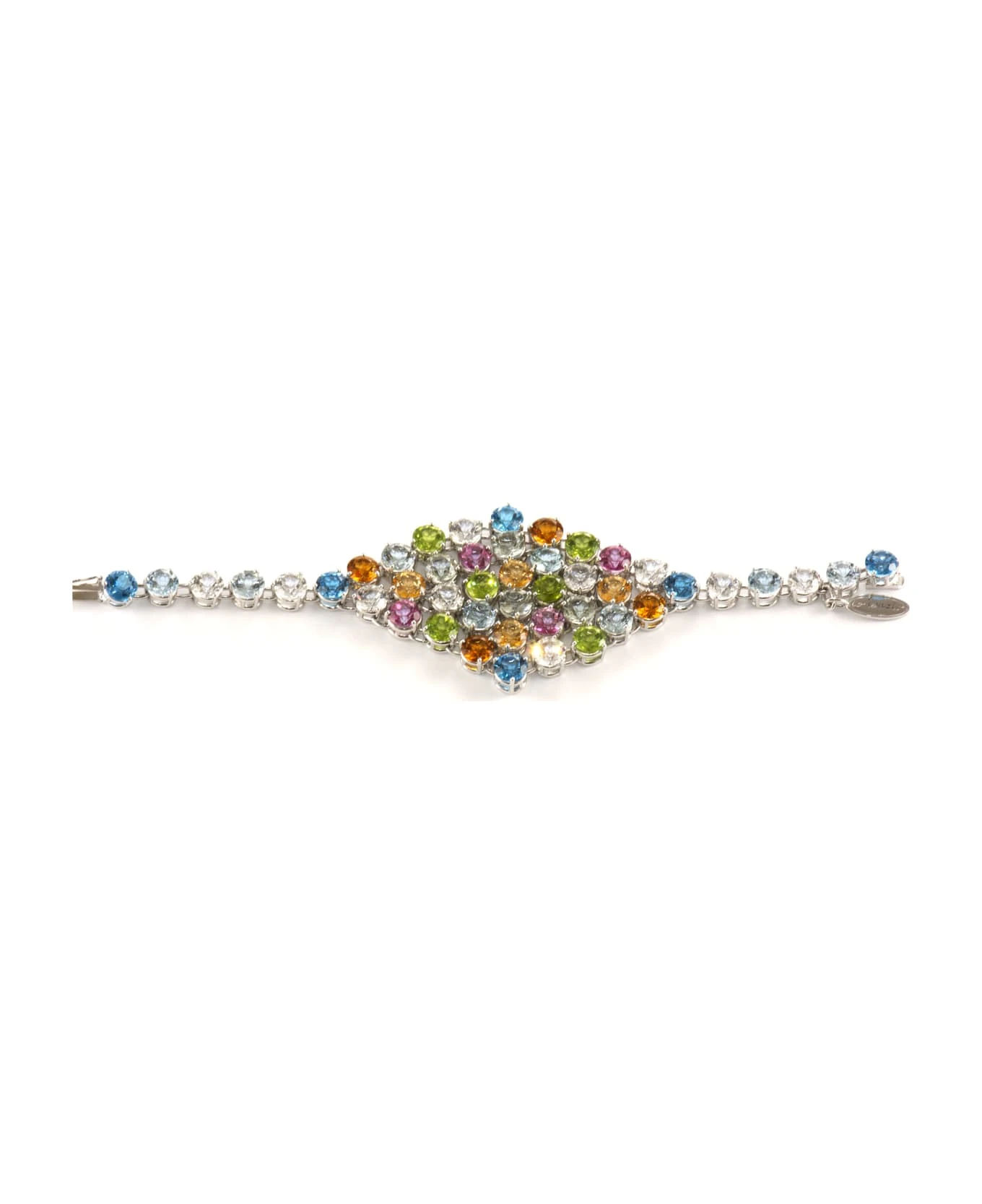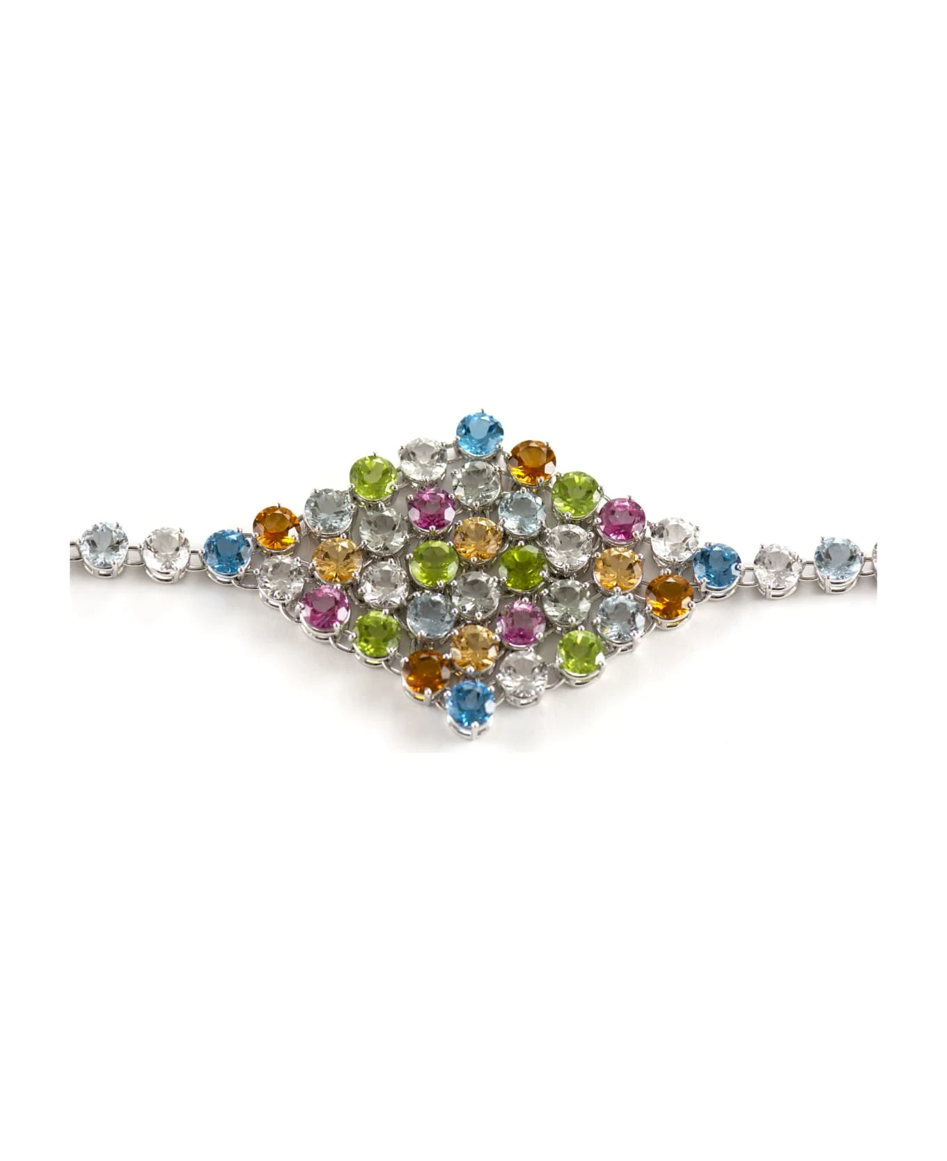 Custom design interwoven bracelet with 7mm faceted round multi-colored gemstone in prong set; Aqua Marine, Citrine, Peridot, Pink Topaz, Green Quartz, Honey Topaz, White Topaz, and Blue Topaz