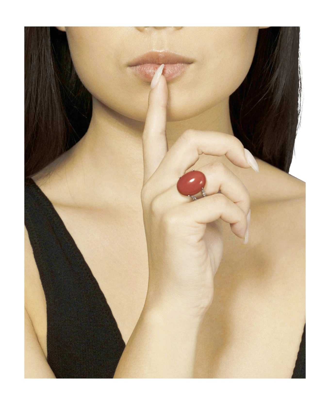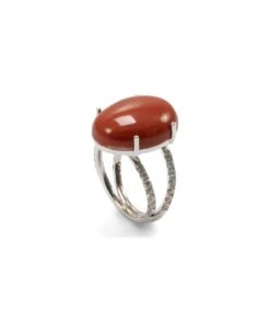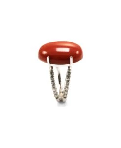 Contemporary design double bands 18k white gold red Mediterranean coral ring with pave’ diamond
