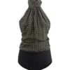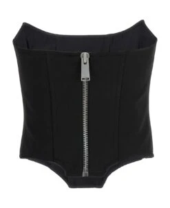 Gabardine corset top, off-the-shoulder design, front logo patch, back zip closure.