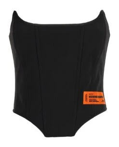 Gabardine corset top, off-the-shoulder design, front logo patch, back zip closure.