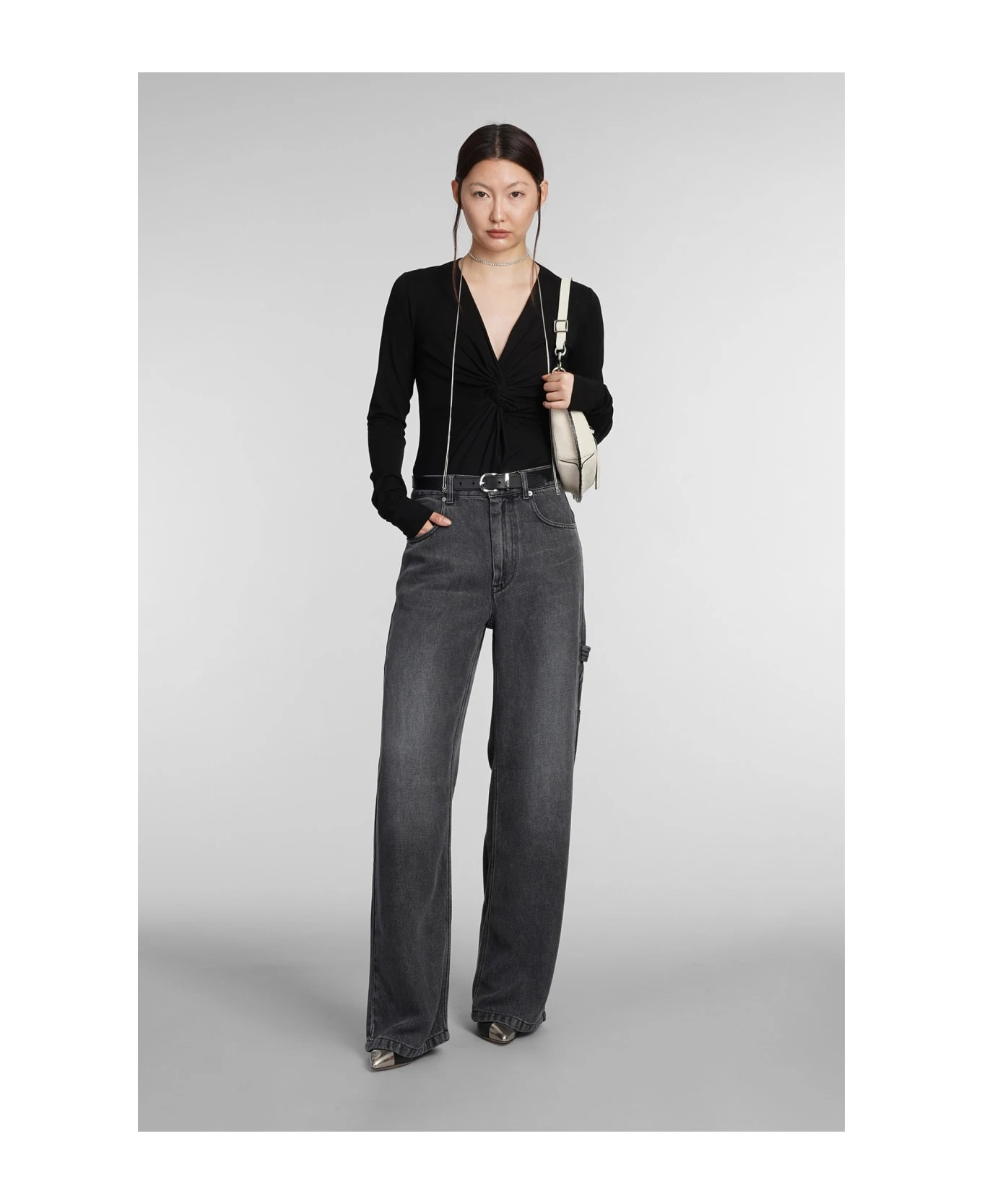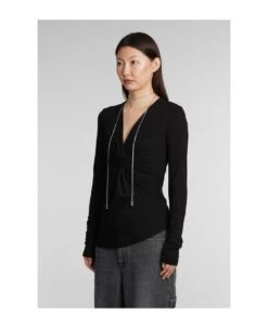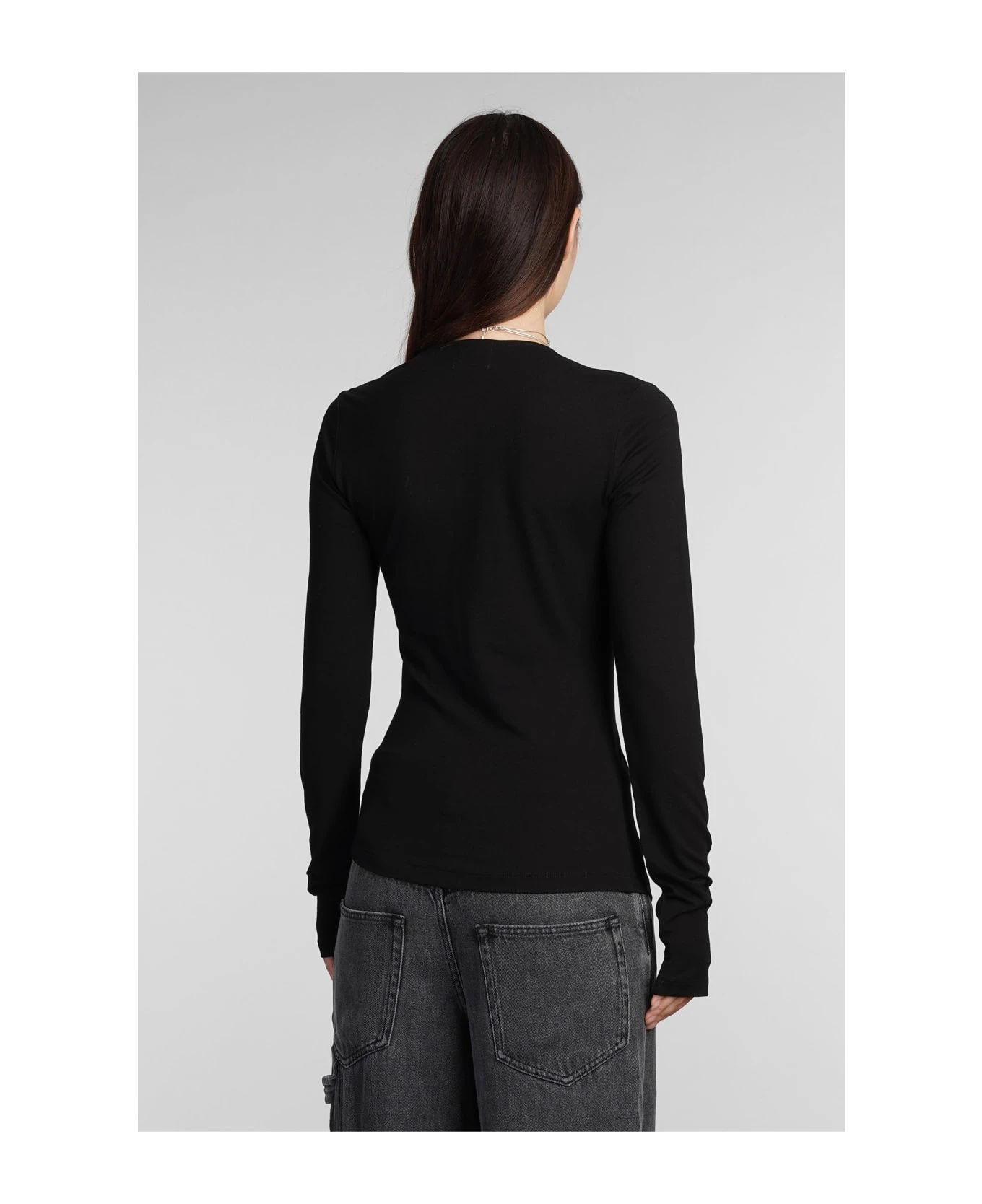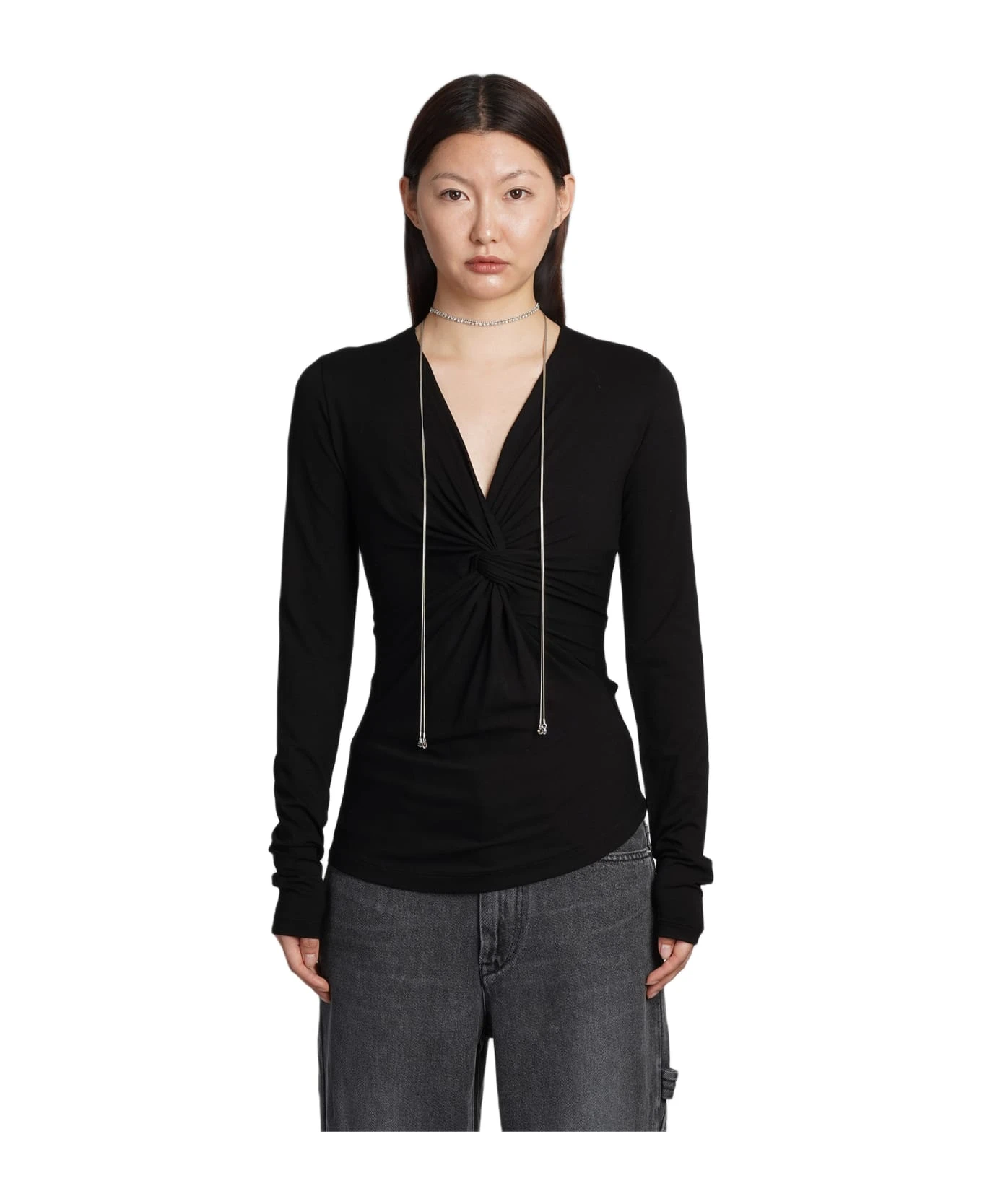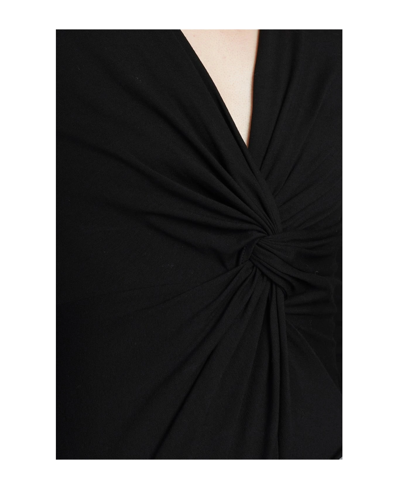 Lyss Topwear in black viscose, V neck, knot detail, long sleeves, 95% viscose, 5% Elastan, Model is 180 cm and wears 36