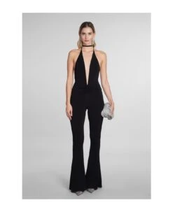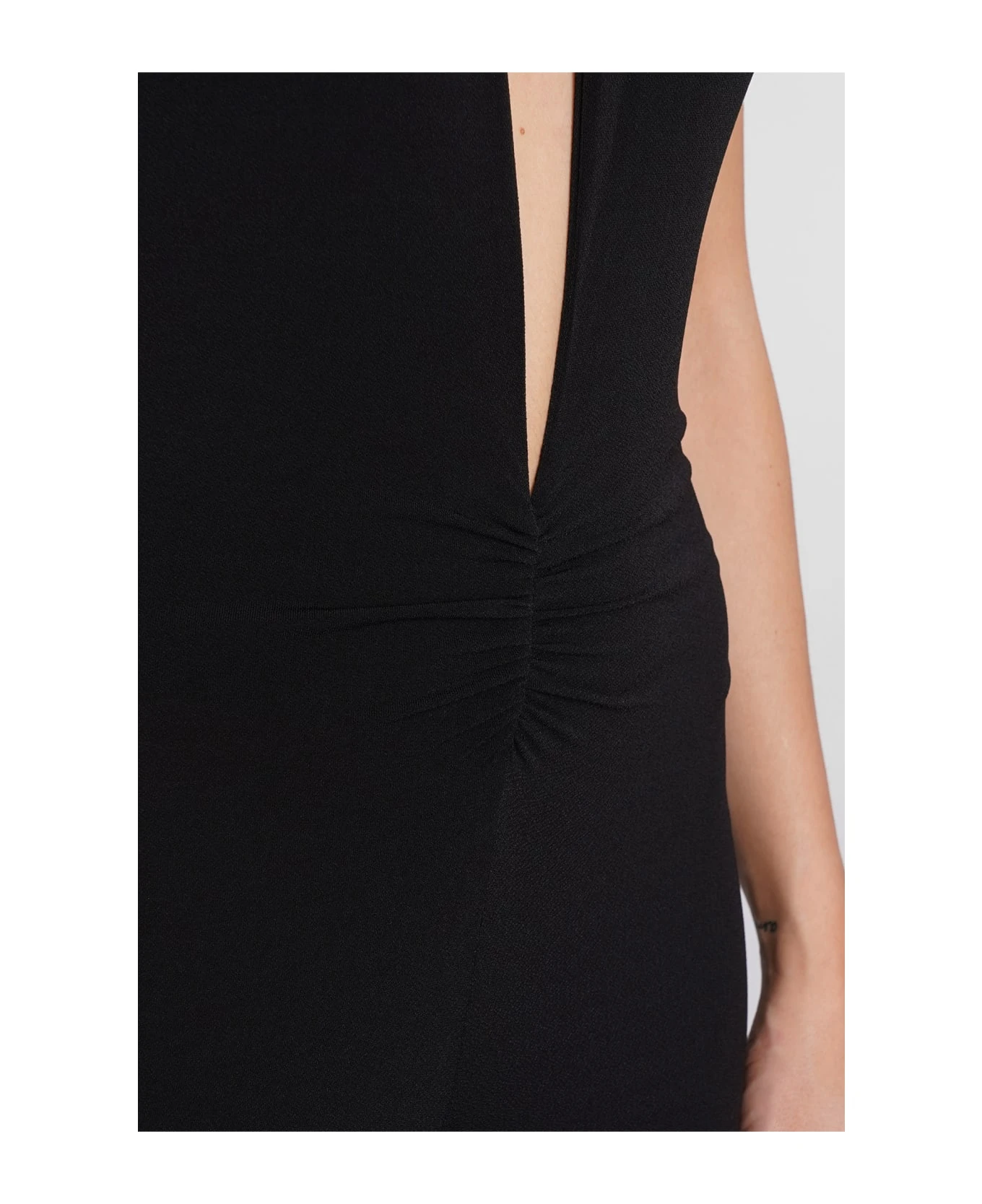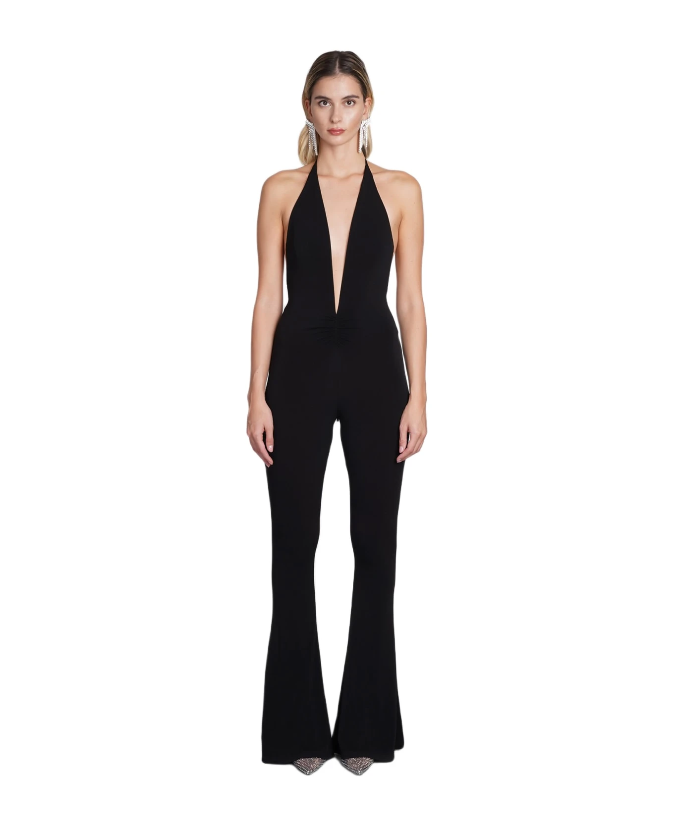 Madonna Suit in black polyester, deep V neckline, Drawstring laces, flared, 95% polyester, 5% Elastan, model is 180 cm and wears size 40, Made in Italy