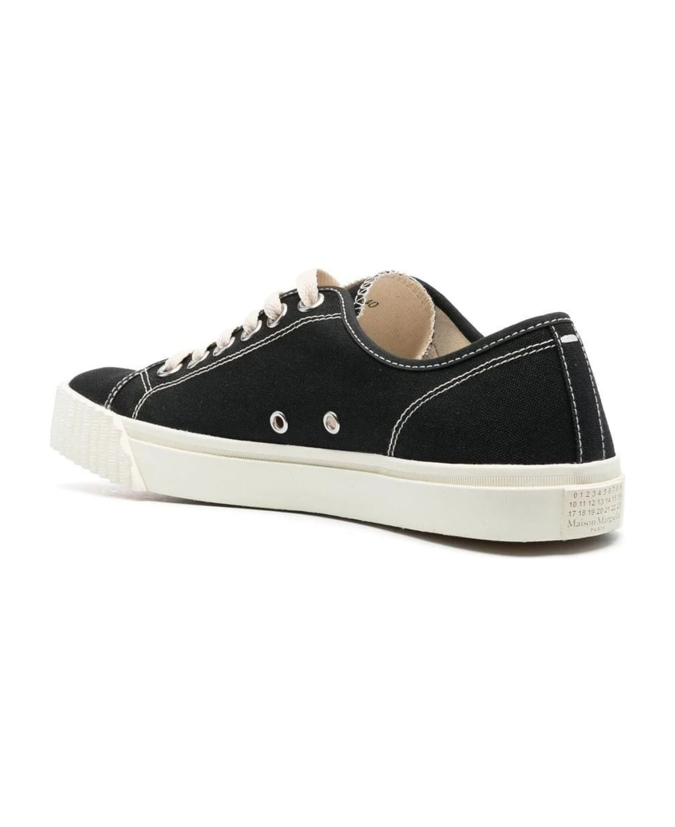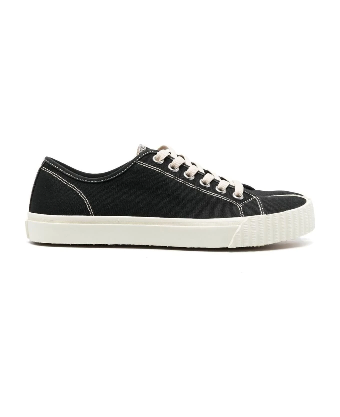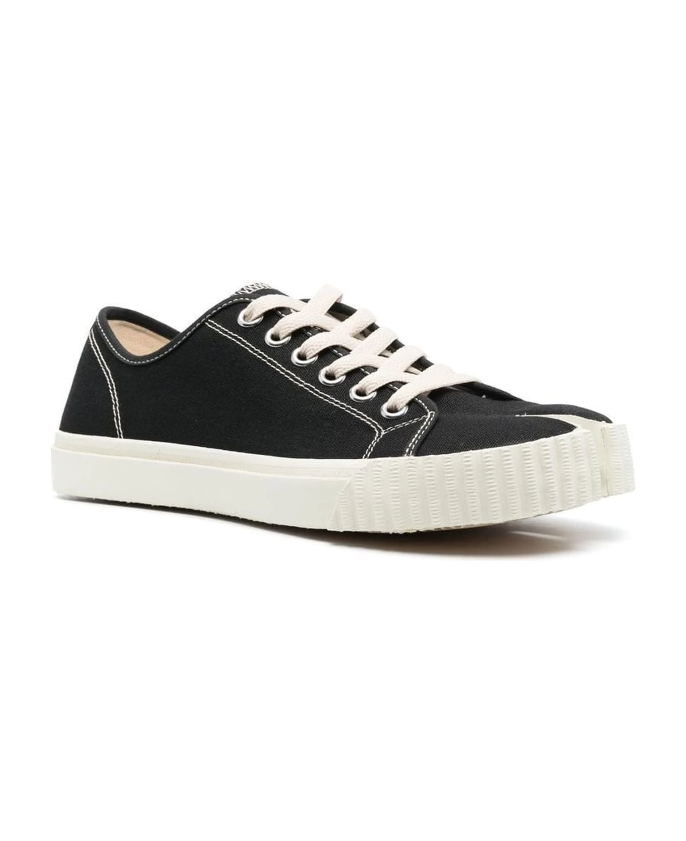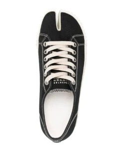 Black canvas Tabi sneakers, lace up shoes, Tabi split toe, logo label on the tab. logo label at the back, white stitching at the back, all-over logo insole
