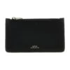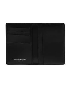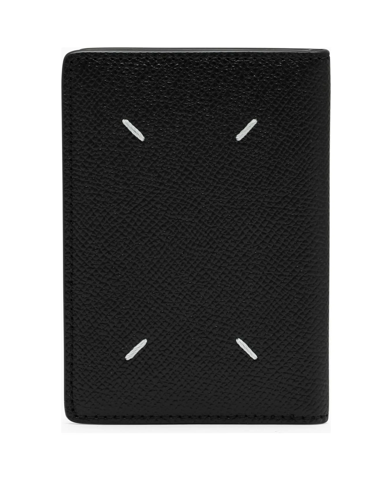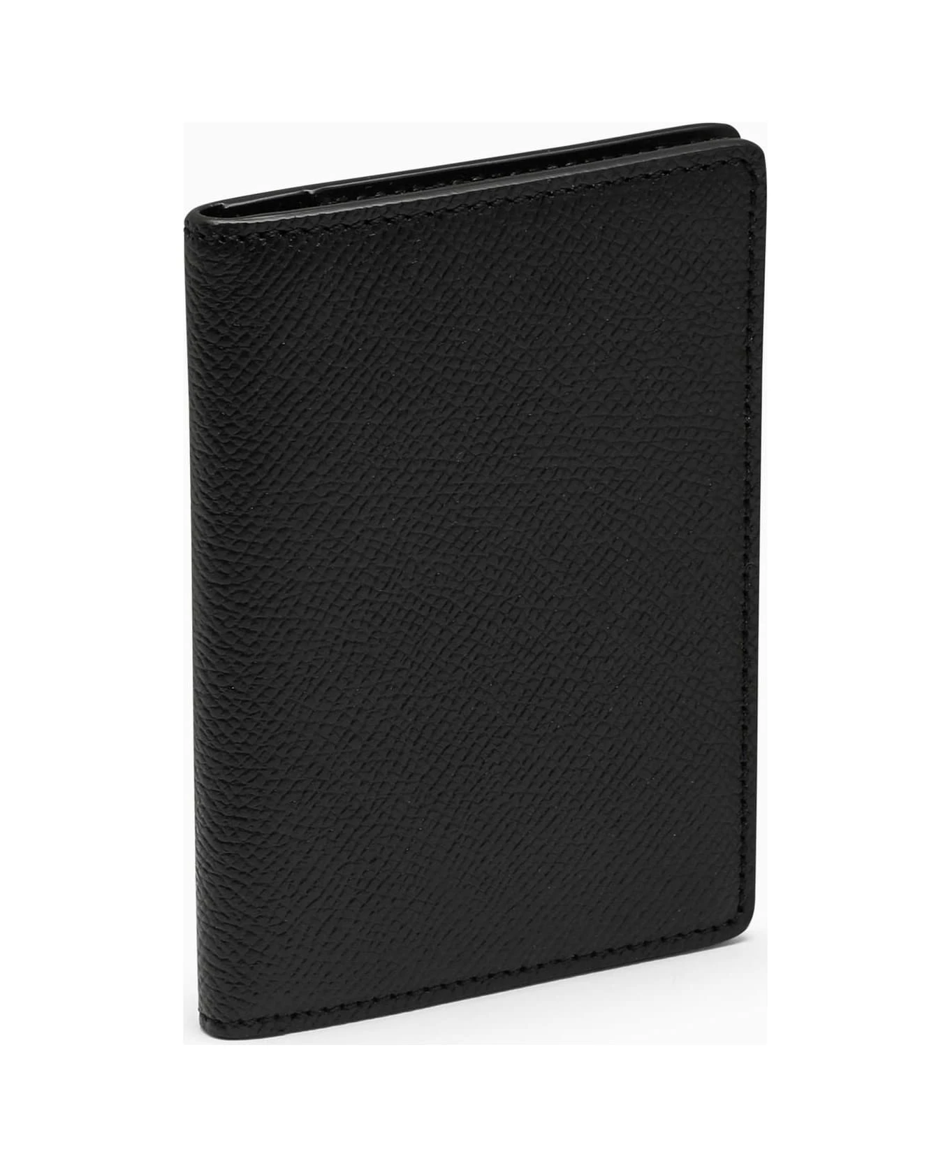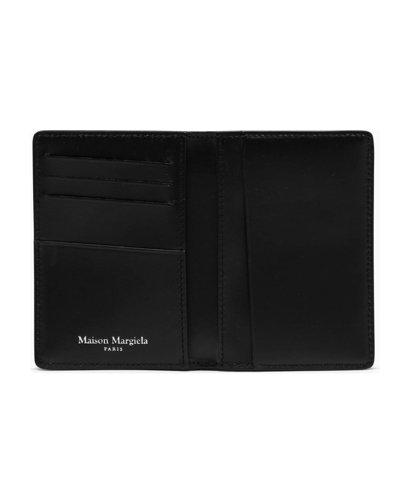 Credit card holder by Maison Margiela in black leather with five credit card slots, logo print on the inside and white stitching on the back.
