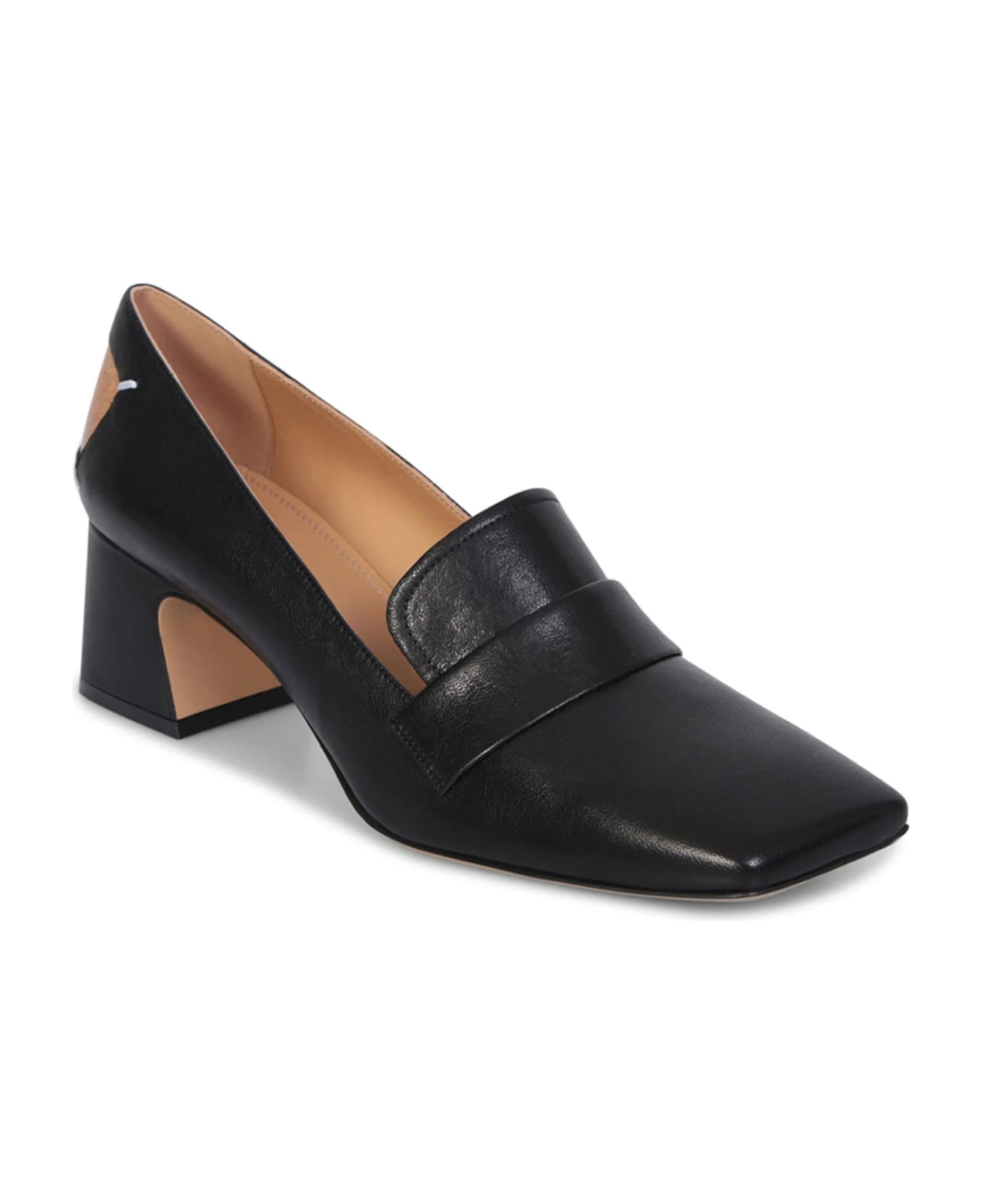 Open toe. Signature Four Stitches logo. Medium wide heel. Color: black