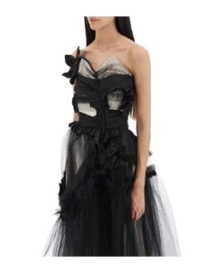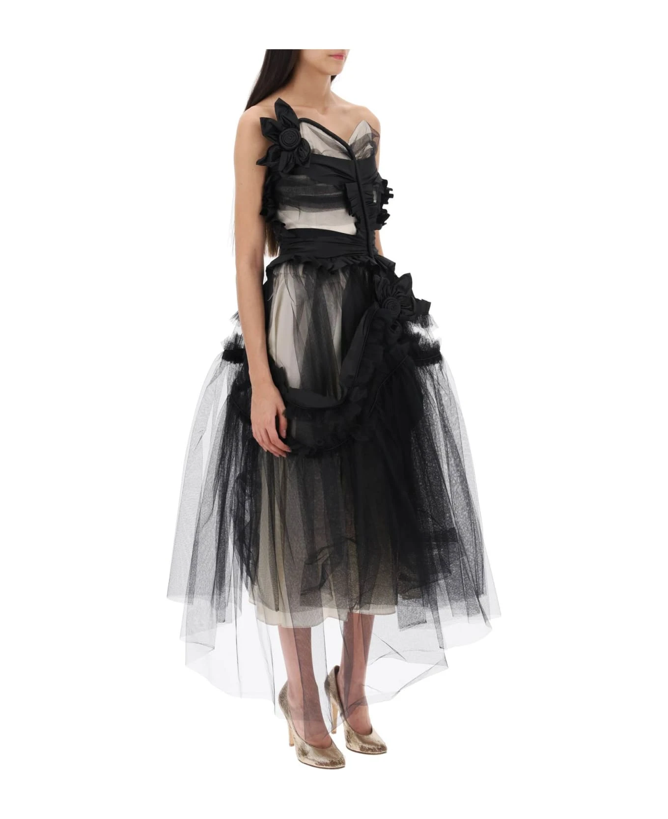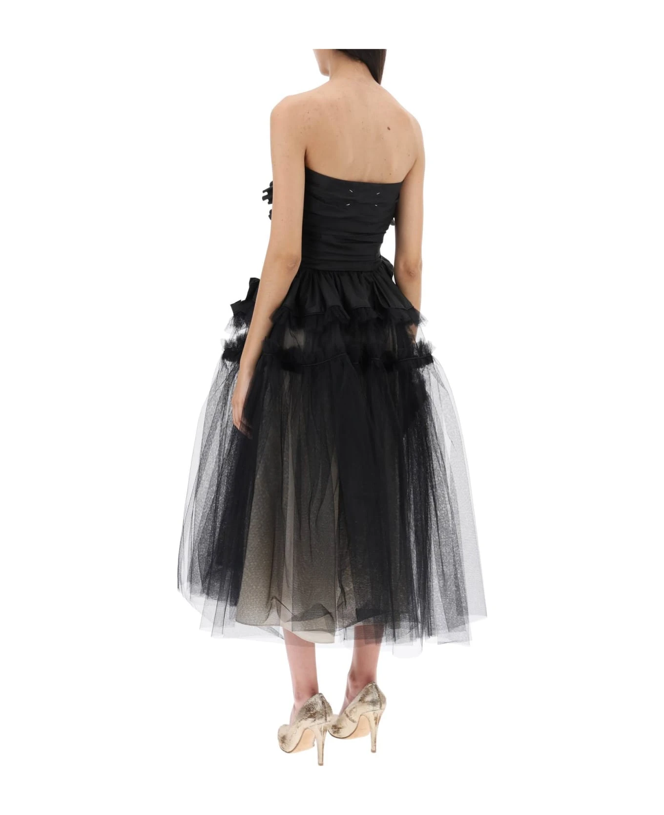 Maison Margiela midi dress crafted in tulle with floral, gathered and raw-cut detailing in taffeta all-over. Characterized by a layered construction with exposed contrasting lining, this design features a gathered bustier bodice with inner boned seams, side zipper closure and a voluminous circular skirt with asymmetrical frill. The model is 177 cm tall and wears size IT 40.