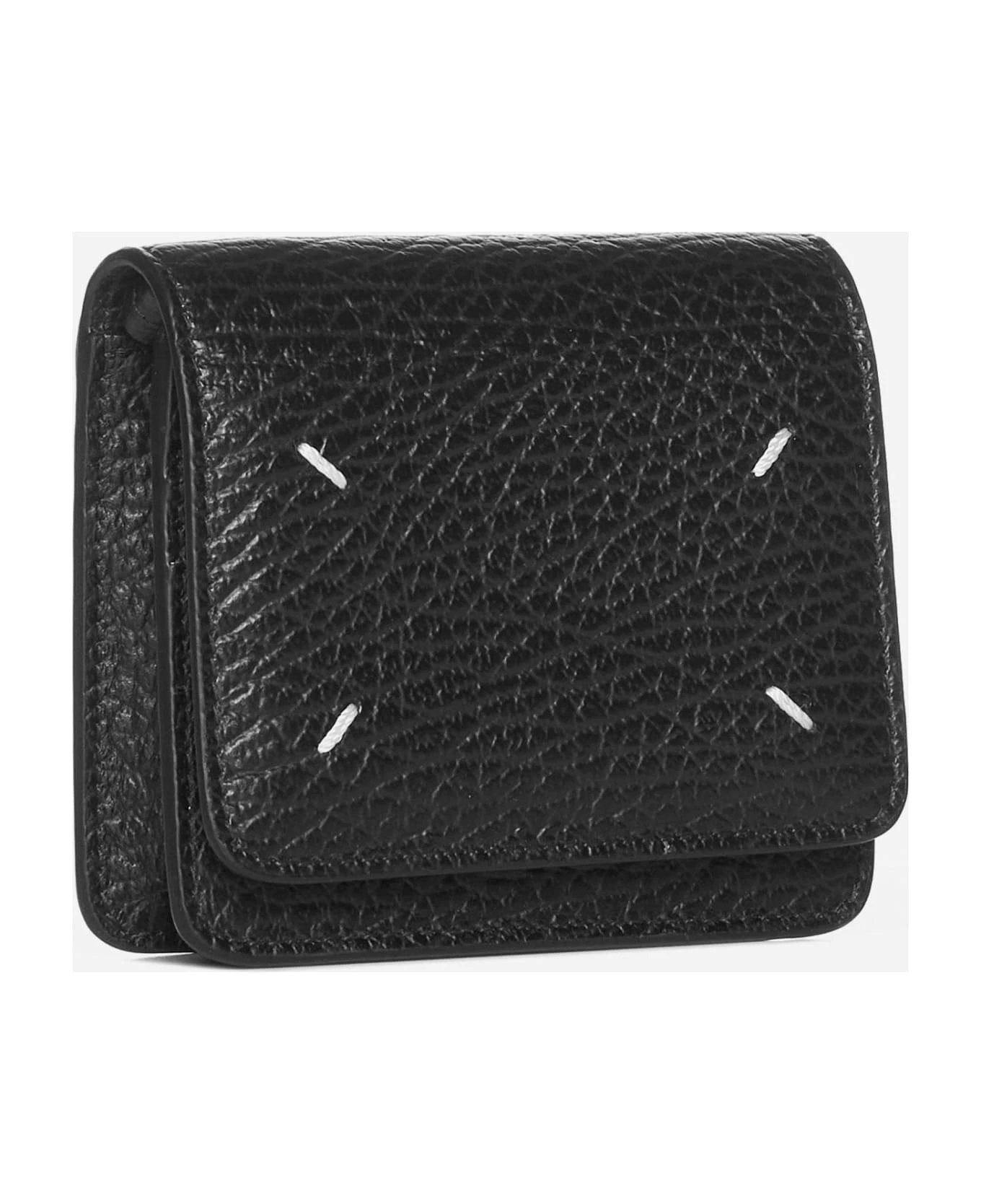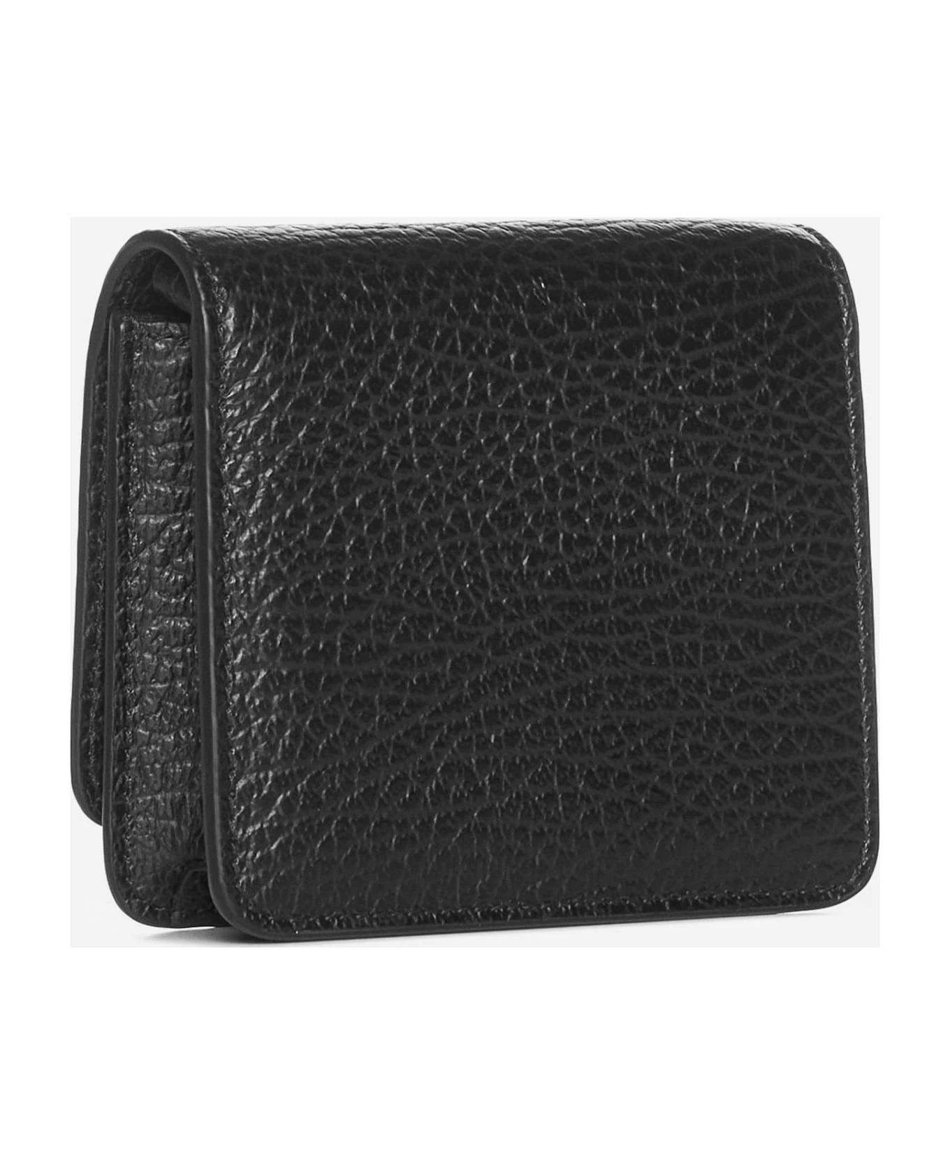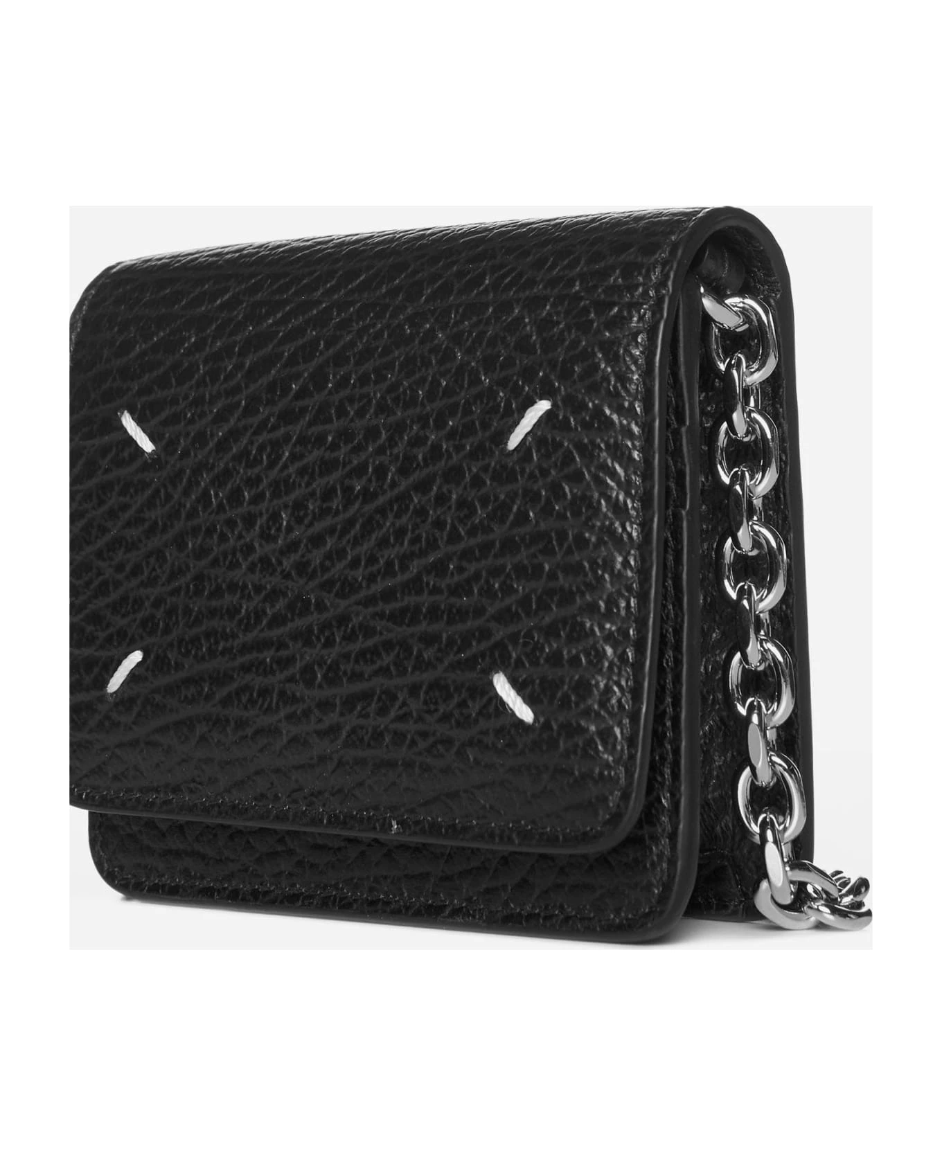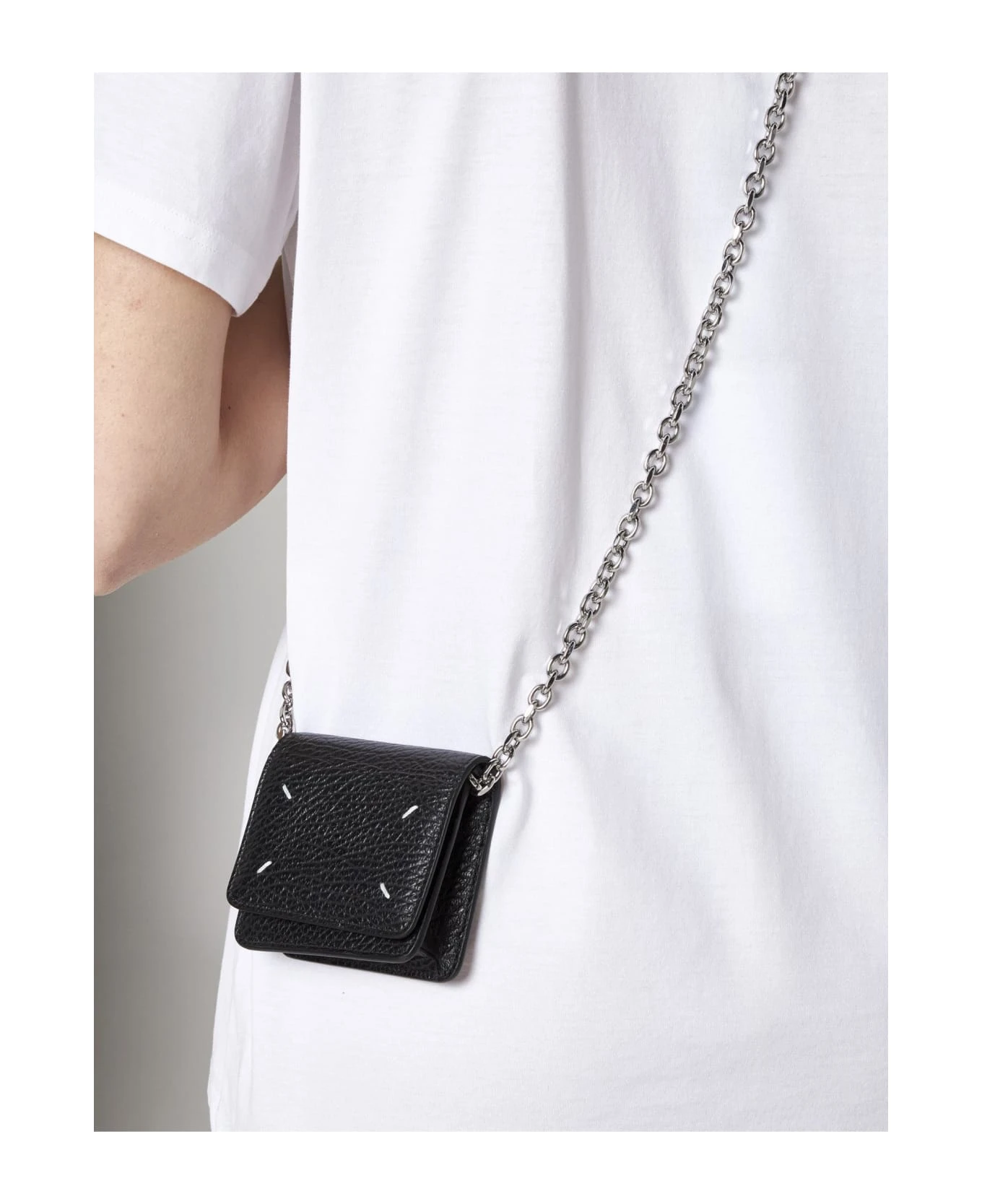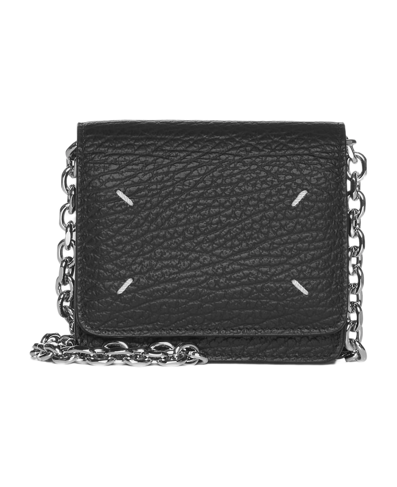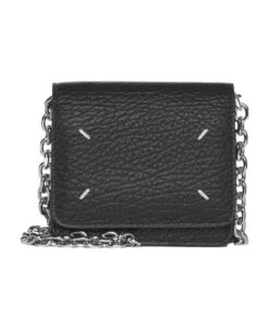 Maison Margiela’s black grained leather small wallet bag featuring a chain shoulder strap, concealed magnetic fastening, four-stitched logo at the flap, numerical logo printed inside, inner zip pocket, card slots and silver-tone metal hardware.
