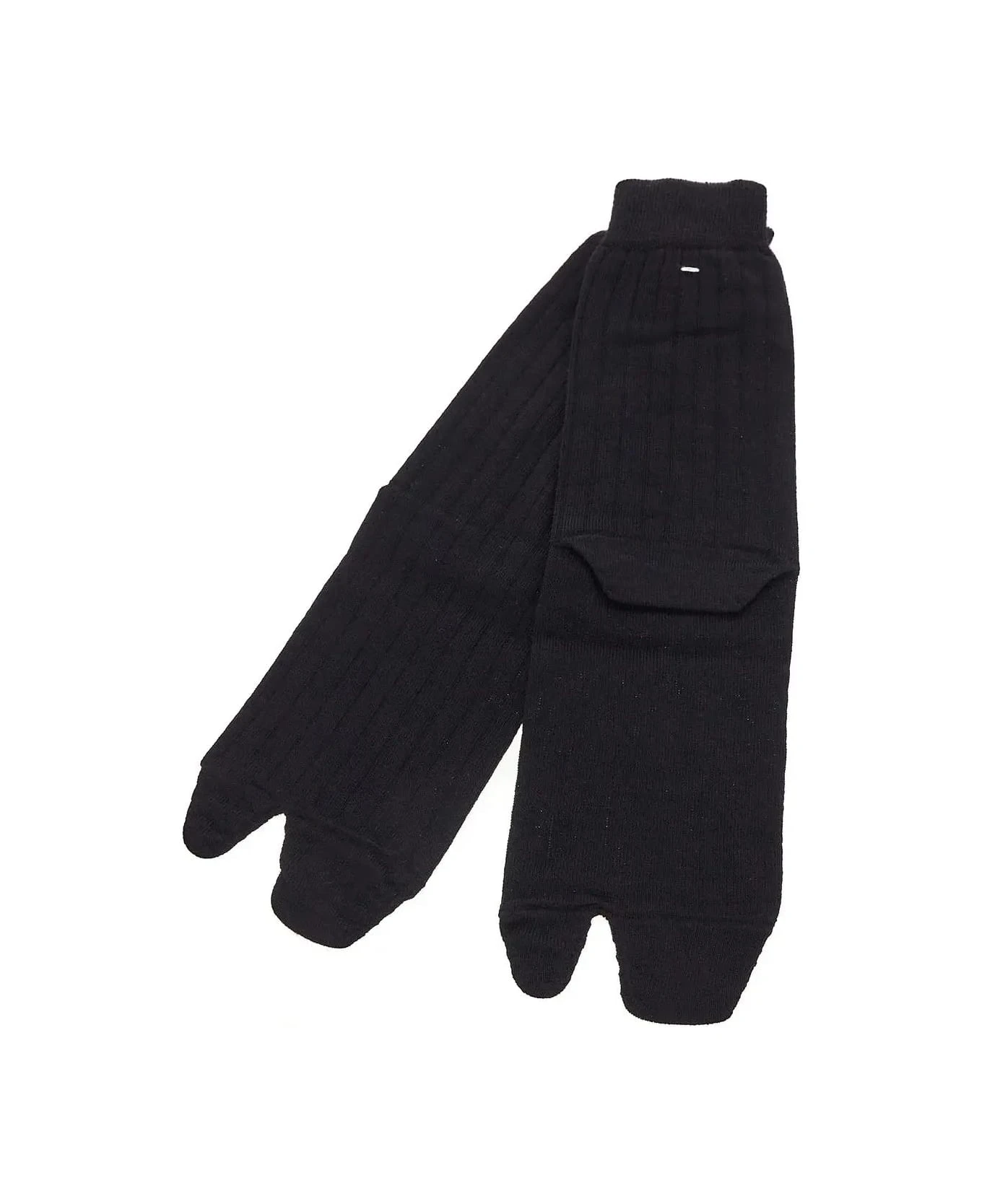 Maison Margiela socks in black wool jersey with split-toe, ribbed top, mid-calf length and contrasting white stitch at back.