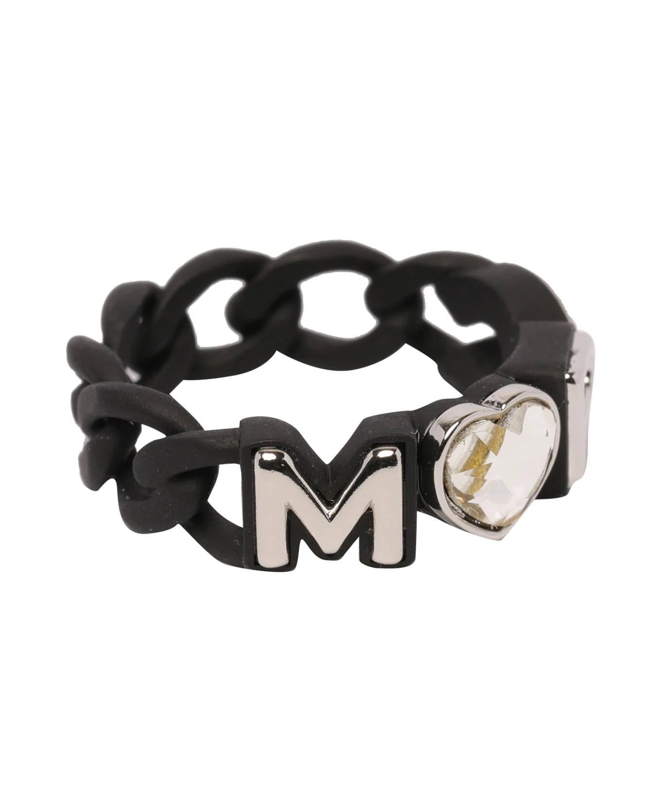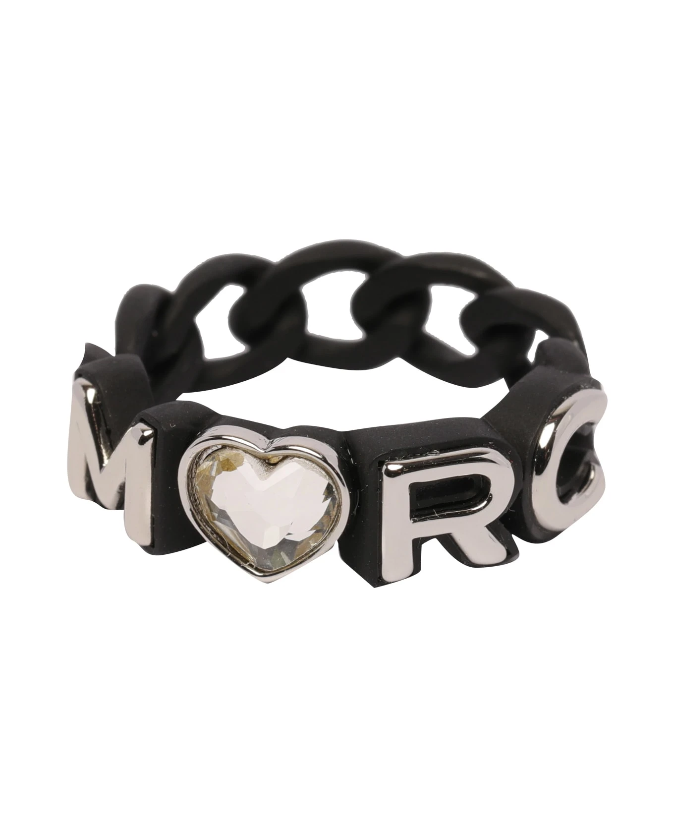 Marc Jacobs black and silver The Charmed Marc Chain ring, logo all over, with crystal heart. Part of the Charmed collection, this ring is designed with a covered black matte chain design and finished with a “Marc” charm and a crystal heart at the center.