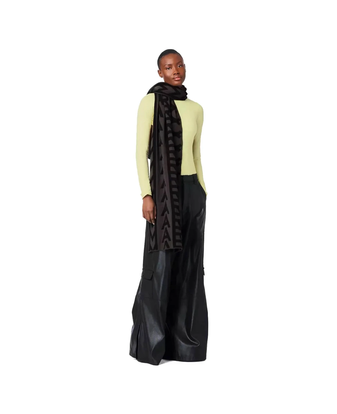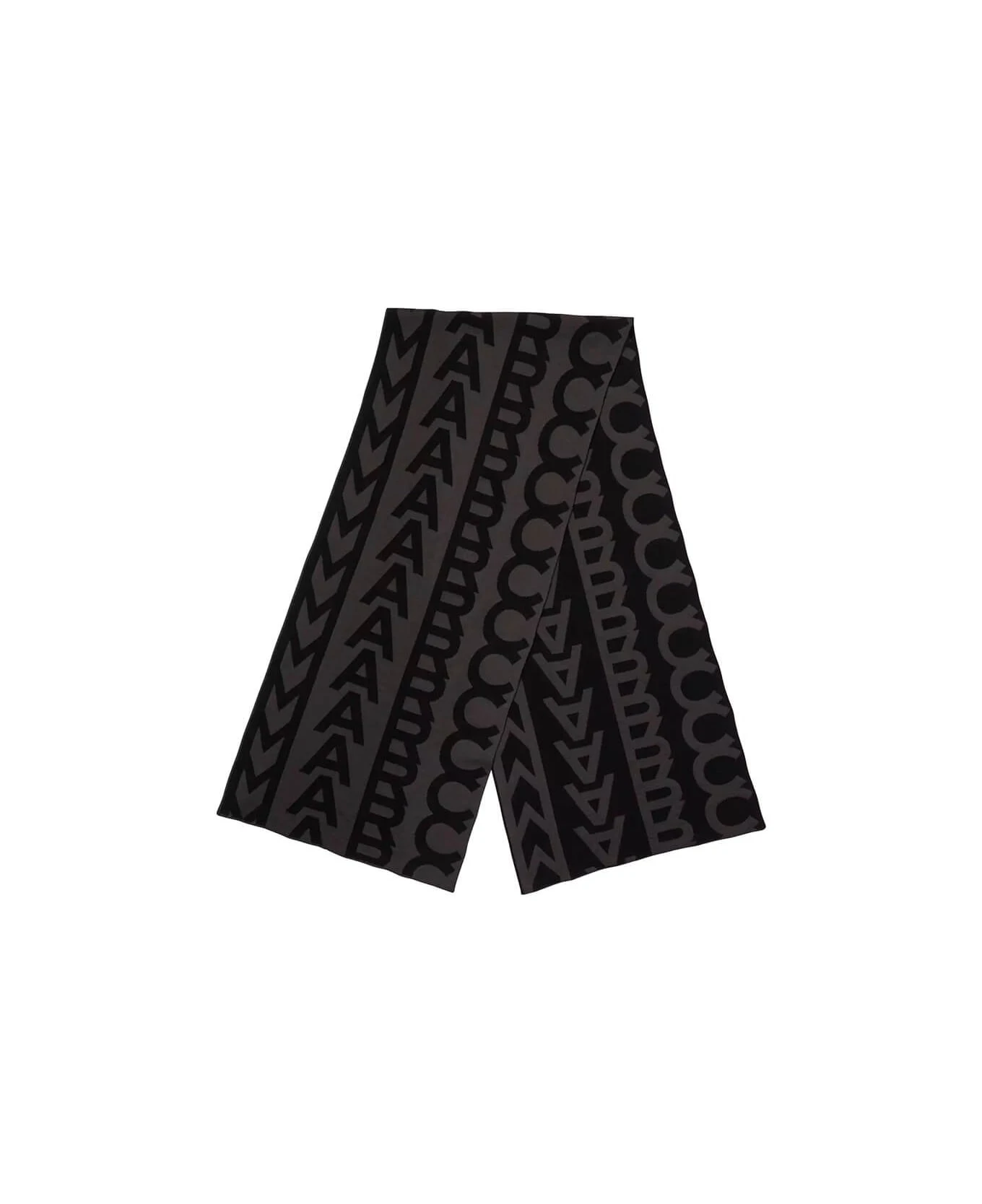 The Monogram Knit scarf by Marc Jacobs made of wool with logo motif in shades of black and dark grey. Measures 205×46 cm.