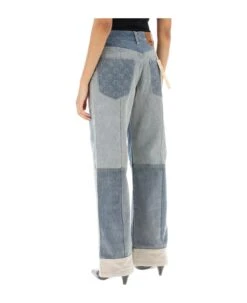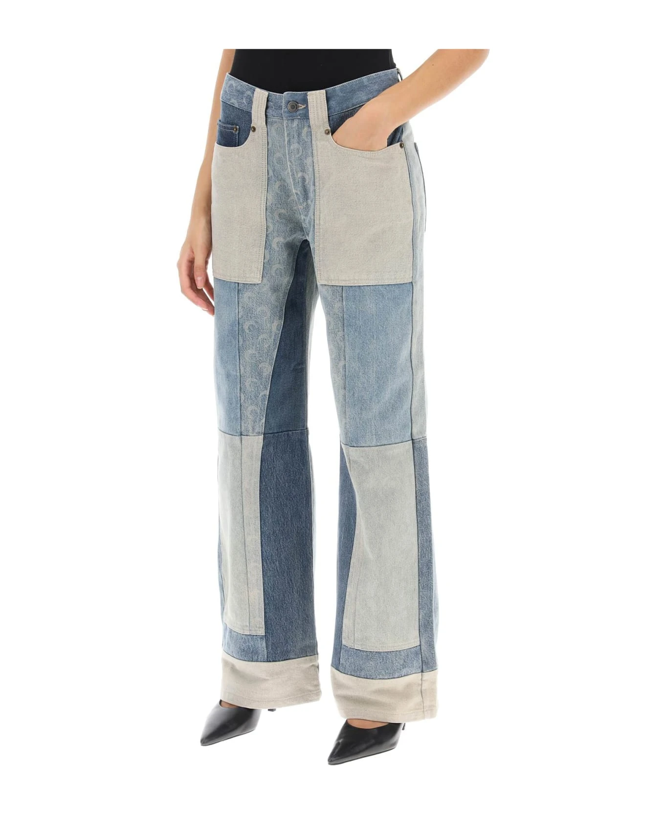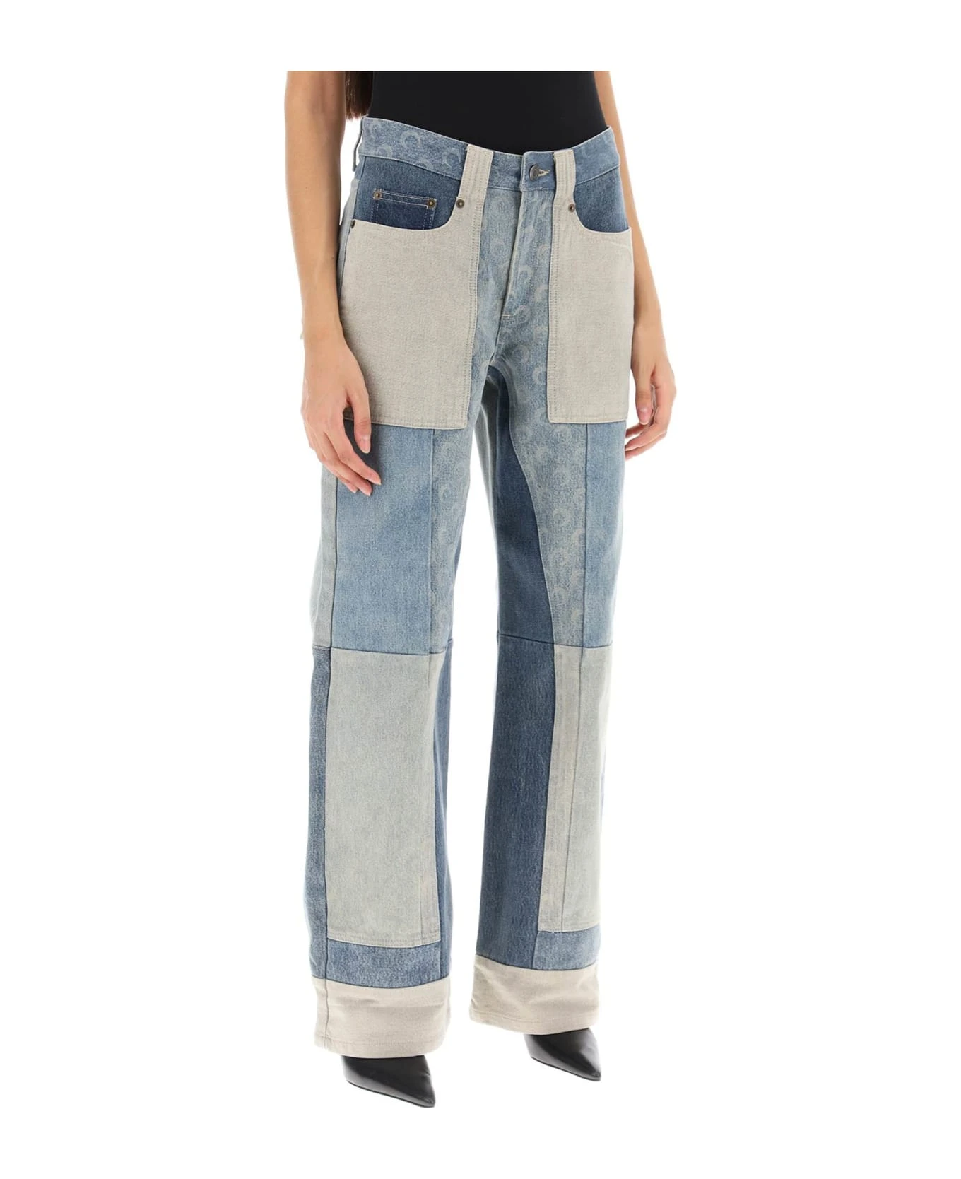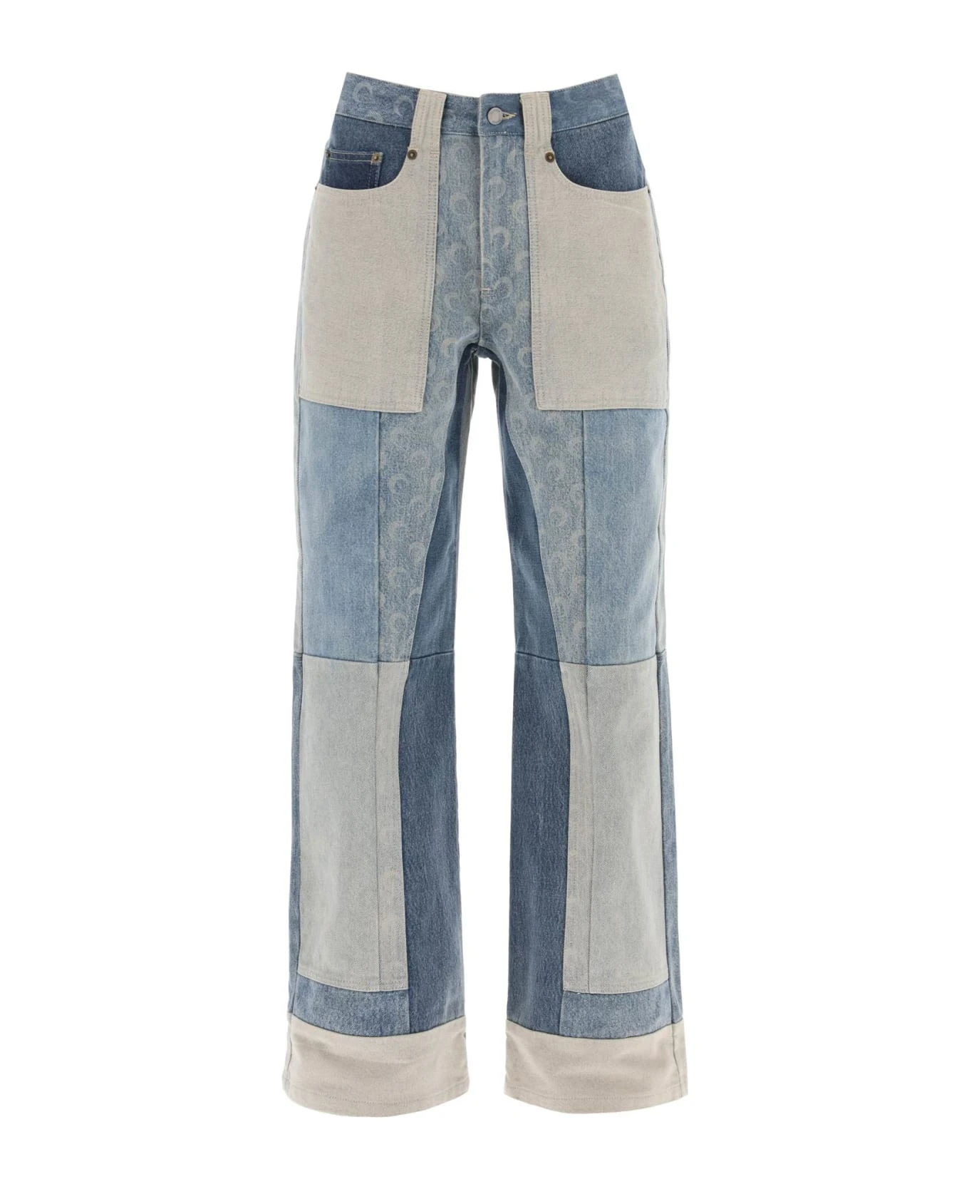 Marine Serre regenerated jeans made from patchwork denim with laser-printed Moon detailing. Designed for a relaxed fit with wide, straight leg and low waist, this piece is finished with belt loops and zip fly with button fastening. The model is 177 cm tall and wears a size FR 36.
