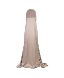 Hoyo long petticoat dress by Max Mara made of precious heavy pink pure silk satin, with an American neckline and armholes finished with a matching fabric trim. The fluid and feminine silhouette is characterised by a wide drape at the back that creates a small train at the bottom. Invisible back zip fastening.