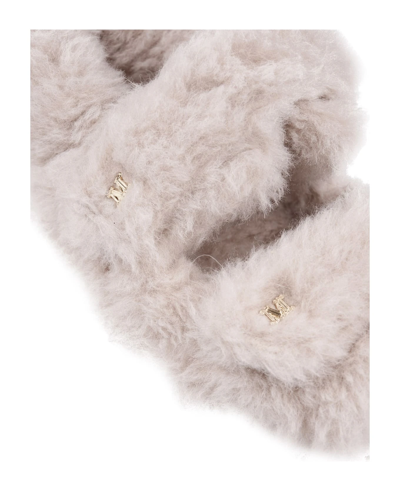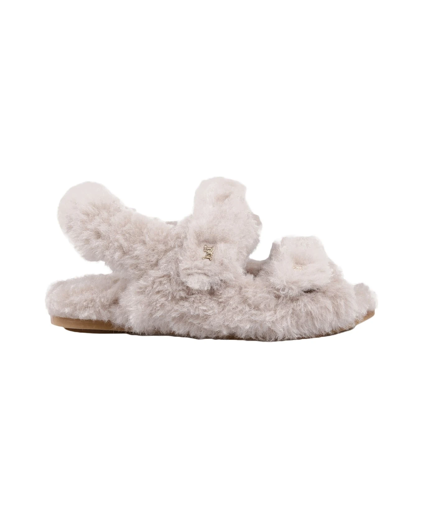 Sandyc flat sandals with double strap by Max Mara made entirely of sand-coloured alpaca and wool Teddy fabric on a silk base. Wide-platform model characterised by an elastic strap on the back and adjustable bands on the front personalised with micro M monogram detail. Soft and pleasant to wear, this sandal is finished with a tone-on-tone covered footbed and rubber sole. Velcro fastening.