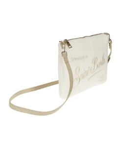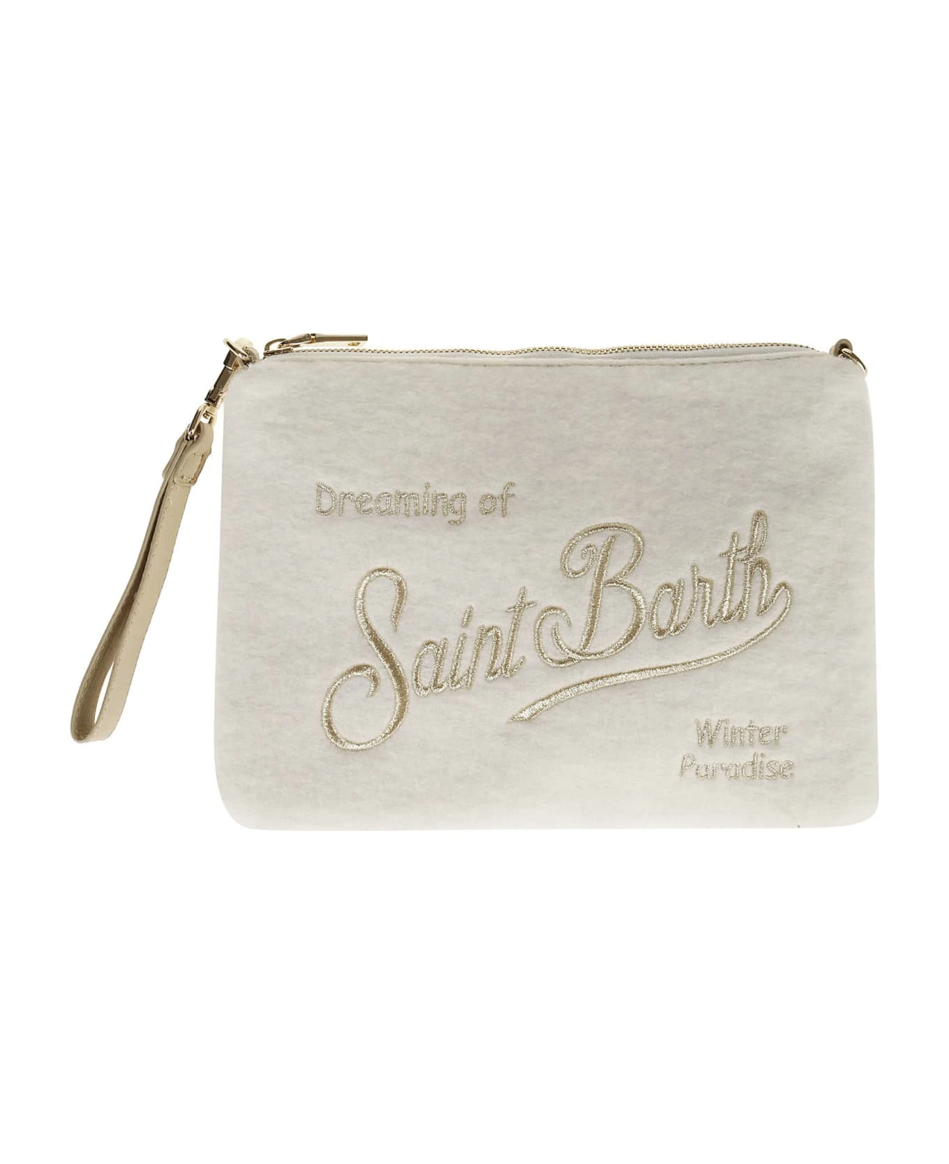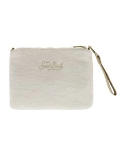 MC2 Saint Barth embroidered logo media clutch, removable eco leather wrist handle, zip closure, inner long shoulder strap. Dimensions: 28 cm x 20 cm. Shoulder strap length 120 cm.