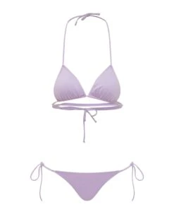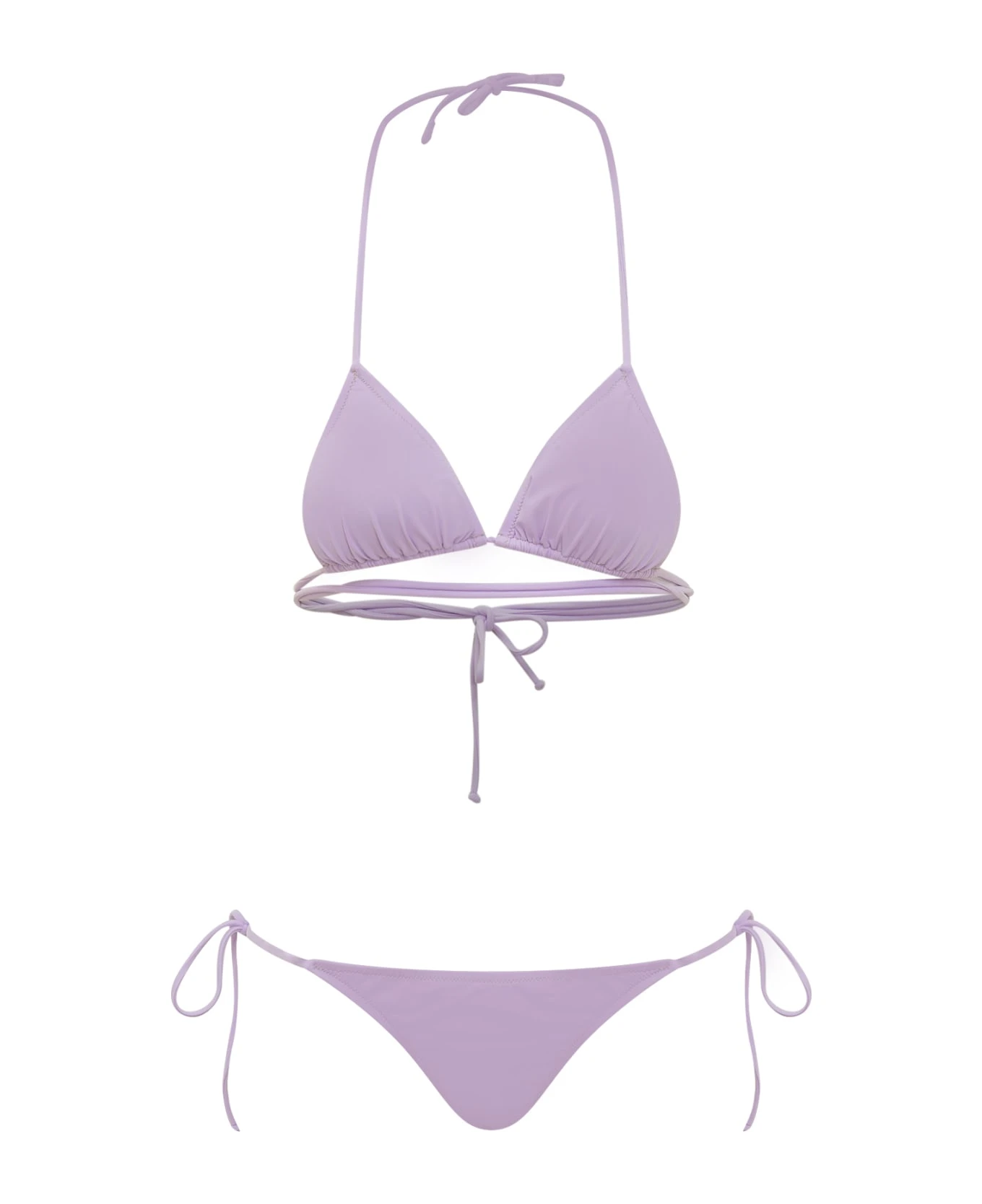 Purple bikini. Adjustable drawstring closure. Long braided ties at front.