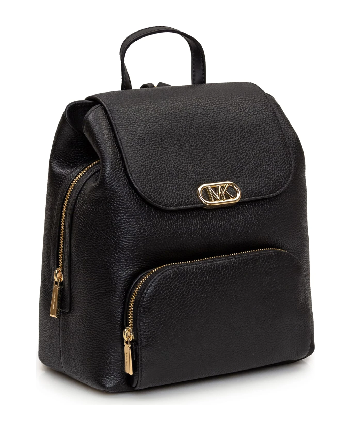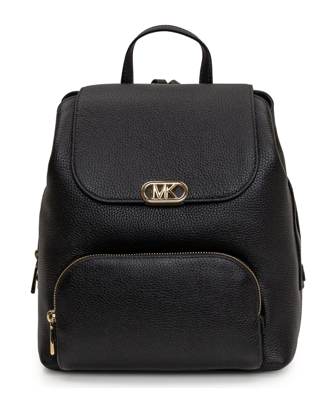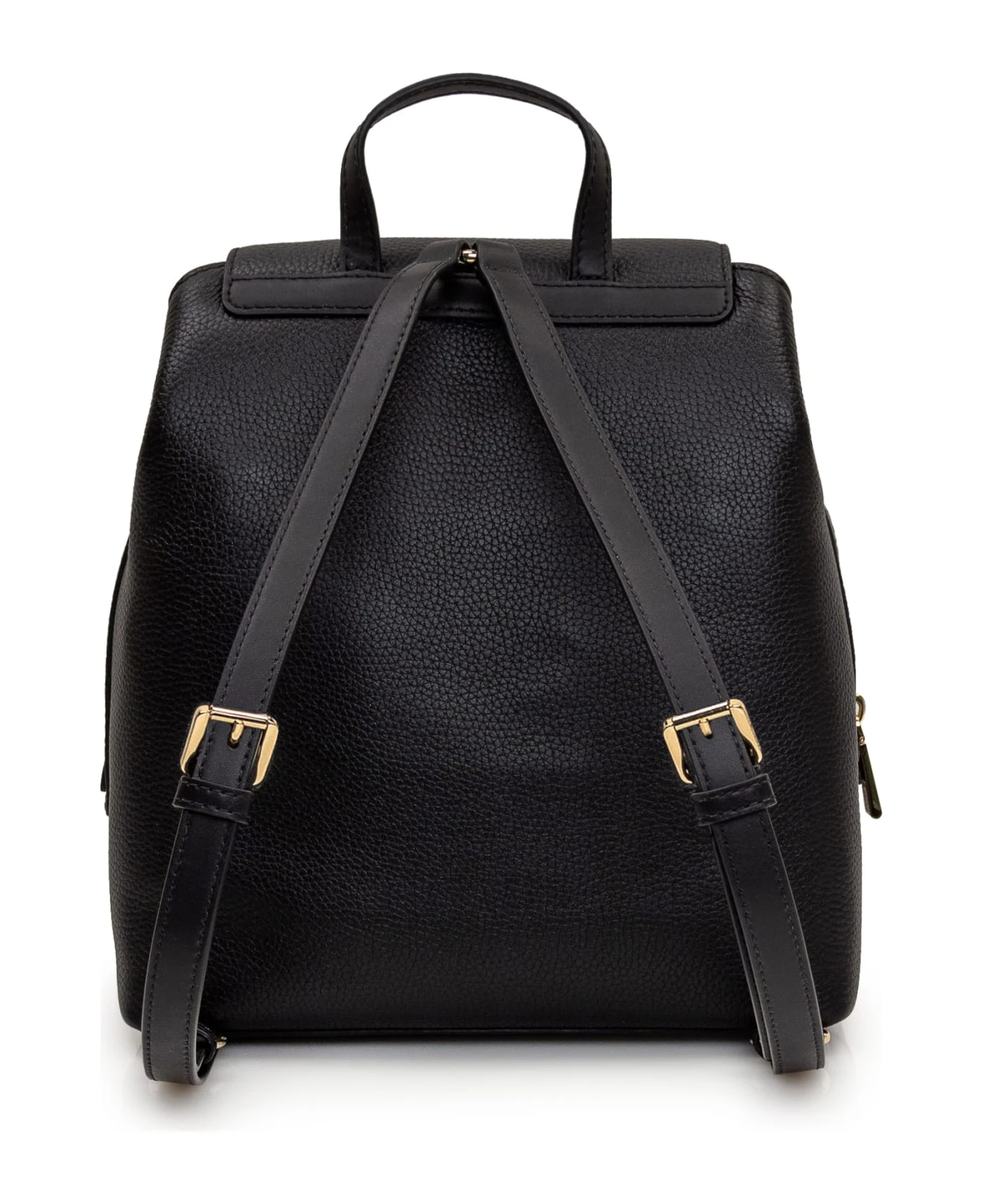 Black backpack in embossed leather. Two adjustable shoulder straps. One handle. Three compartments with zip pocket. Front pocket. Logo on flap.