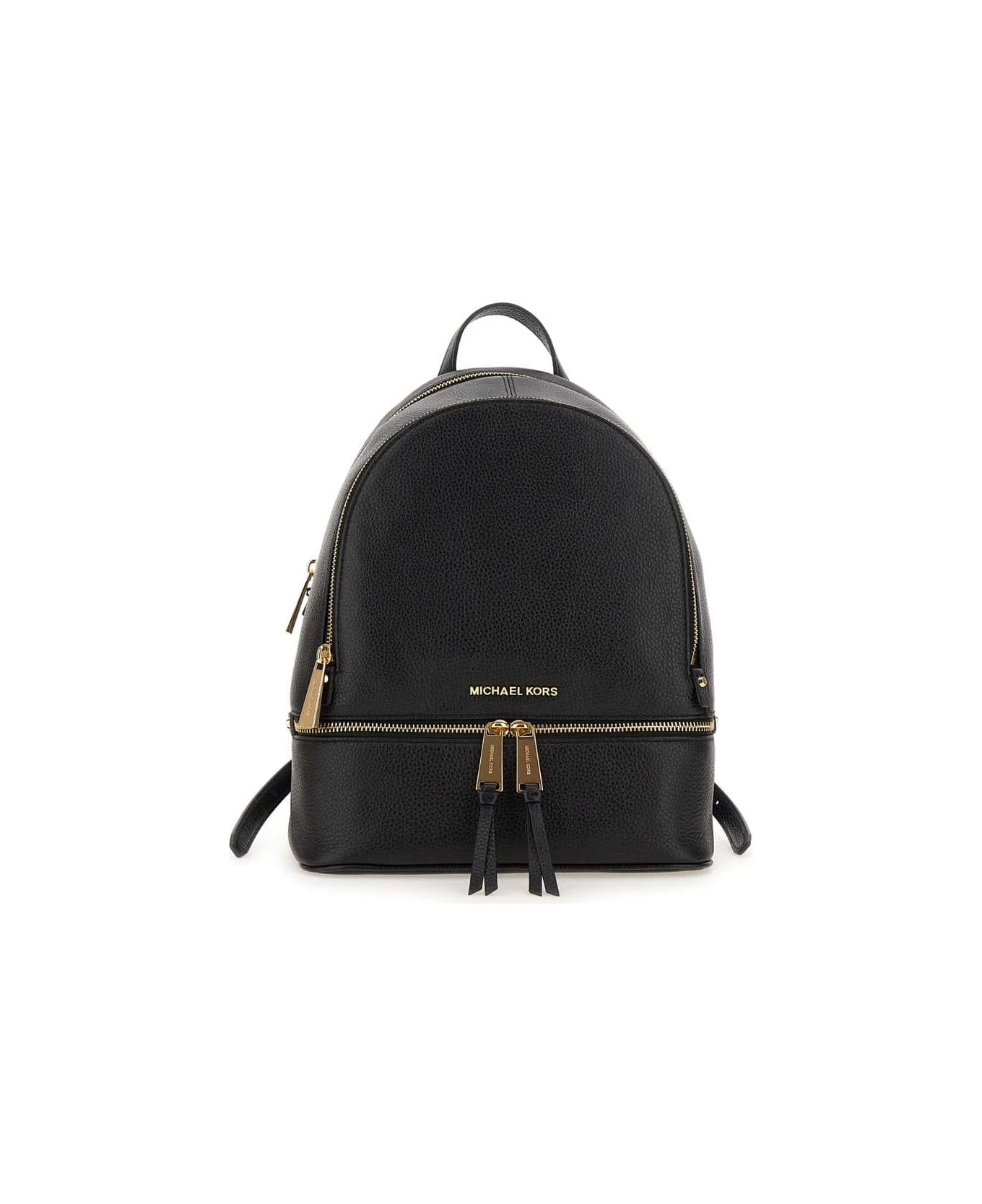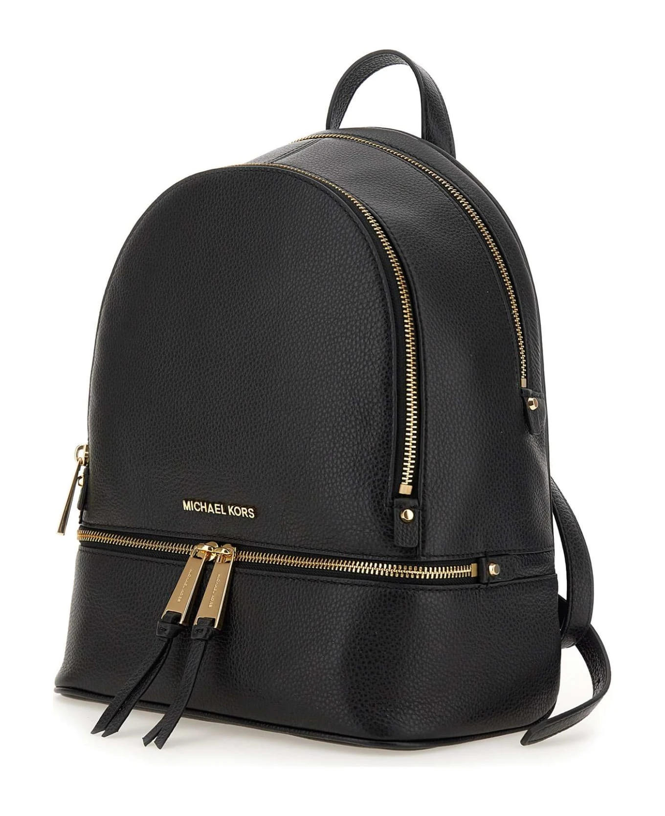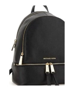 Michael Michael Kors woman “Rhea” leather backpack, one single top handle, black, two adjustable shoulder straps, gold finish metal hardware, metal logo detail, zip fastening, two zip compartments, one pocket front at hem, one internal slot pocket and one with zip. Dimensions: height 33cm, width 25cm, depth 11cm.
