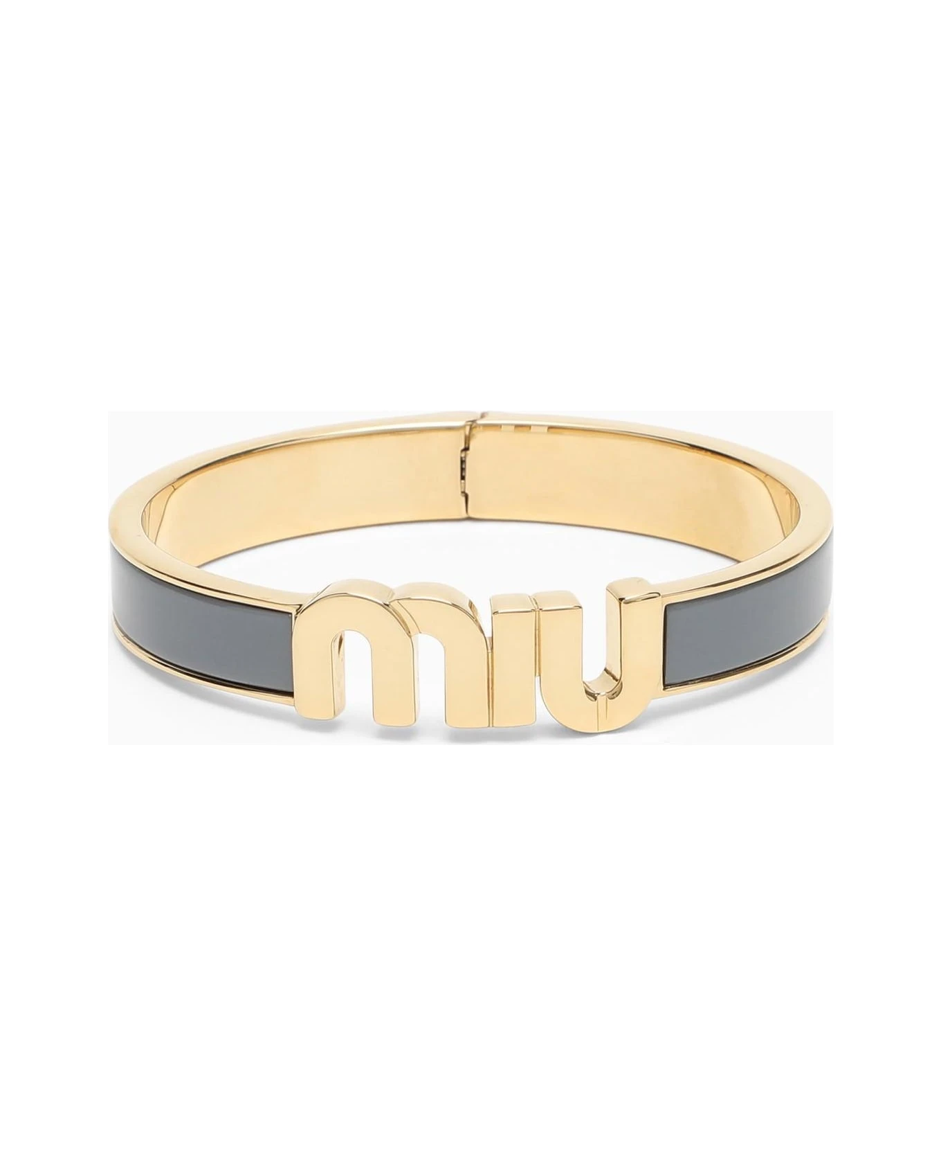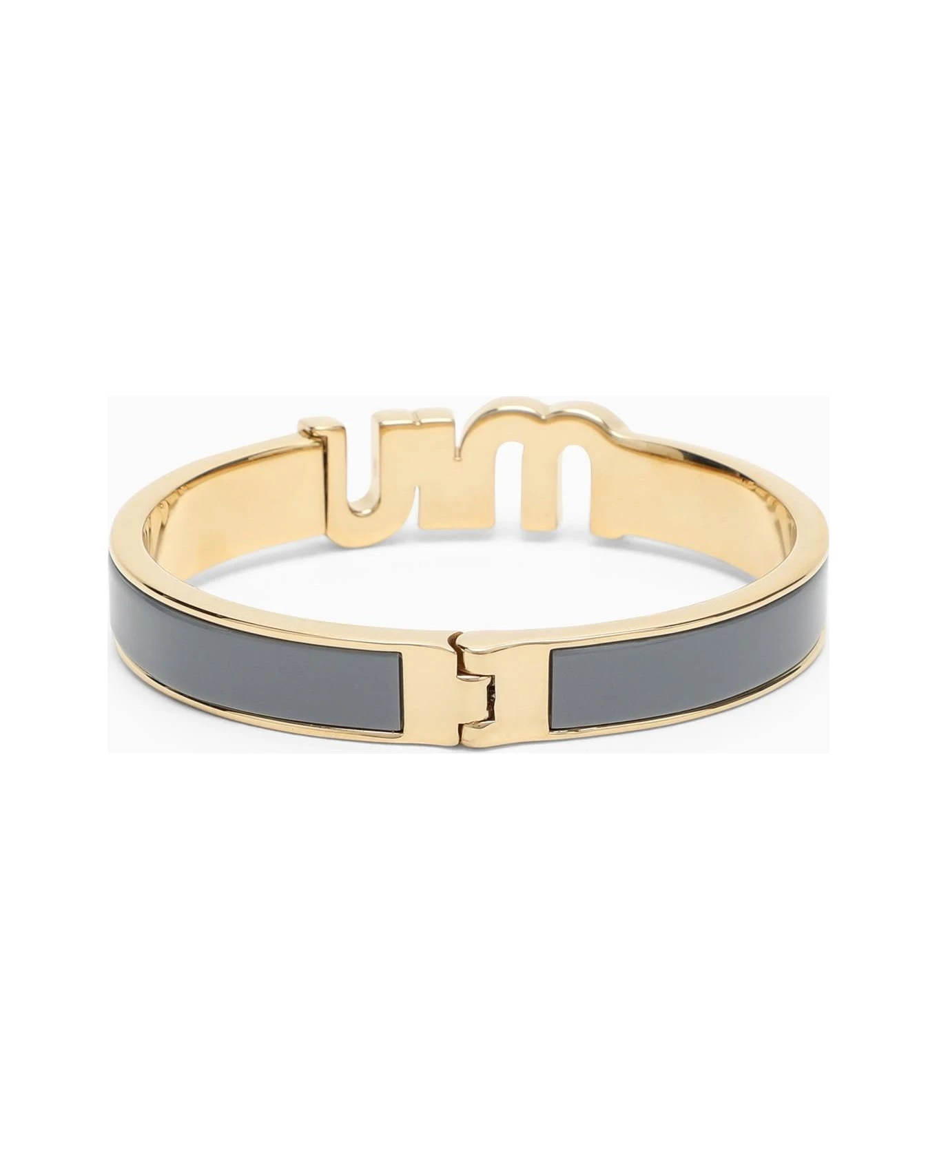 Miu Miu’s rigid bracelet in gold and astrale enamelled metal.