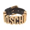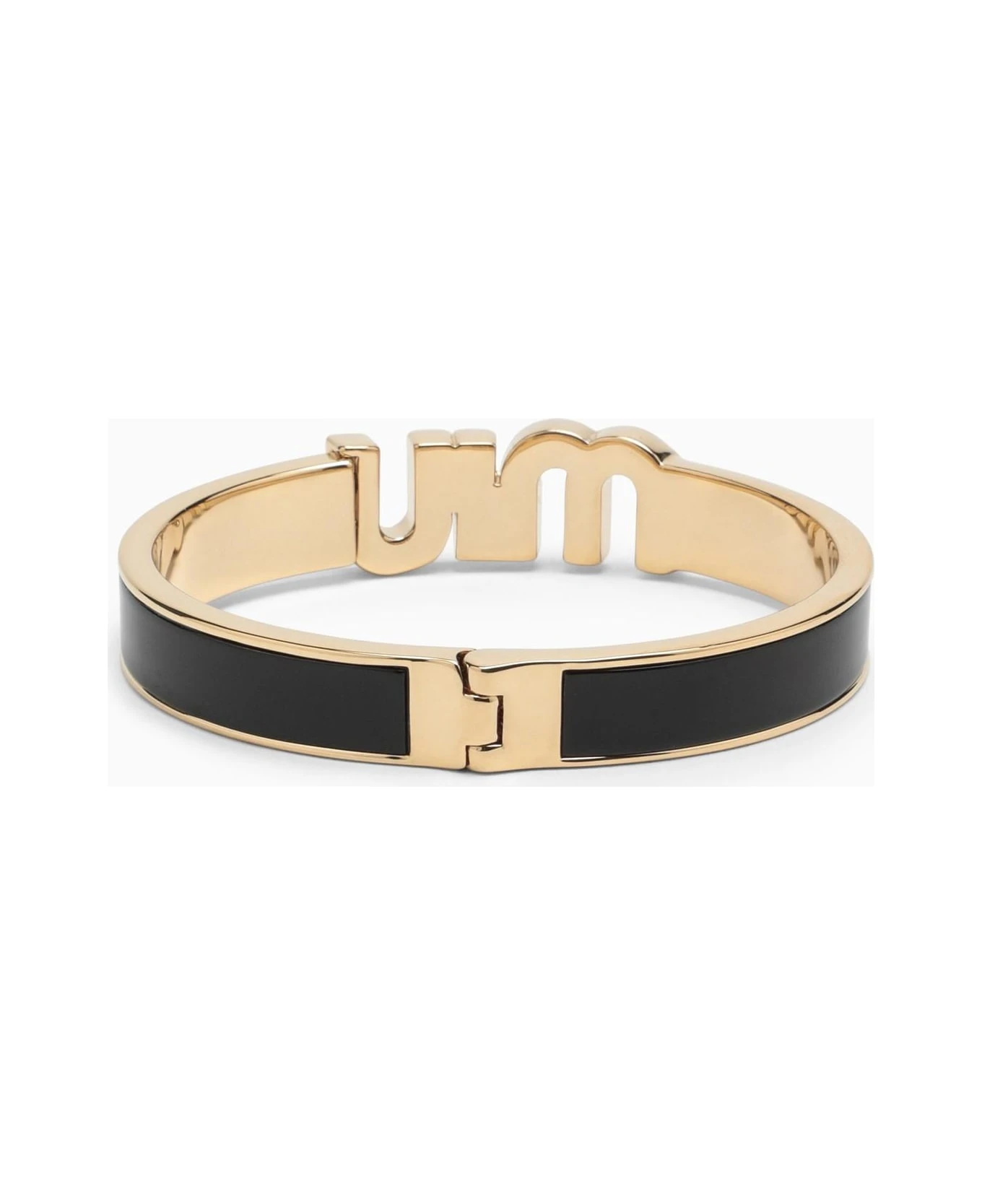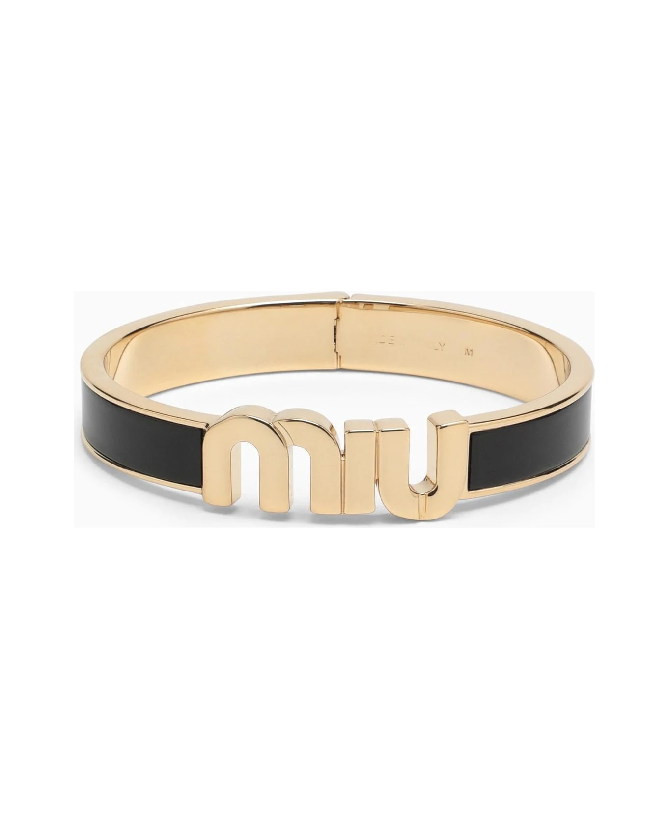 Miu Miu’s rigid bracelet in gold and black enamelled metal.