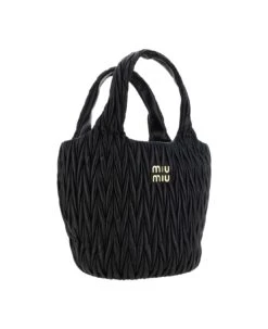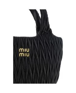 Lambskin miu wander shopping bag by miu miu, unique design, wide top handles, an embossed gold-tone iconic brand monogram on the front, a single internal compartment, an internal slit pocket, and a padded quilted design.