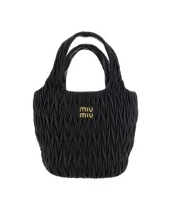 Lambskin miu wander shopping bag by miu miu, unique design, wide top handles, an embossed gold-tone iconic brand monogram on the front, a single internal compartment, an internal slit pocket, and a padded quilted design.