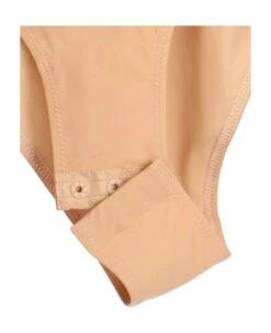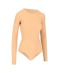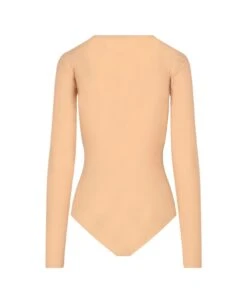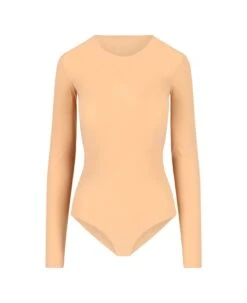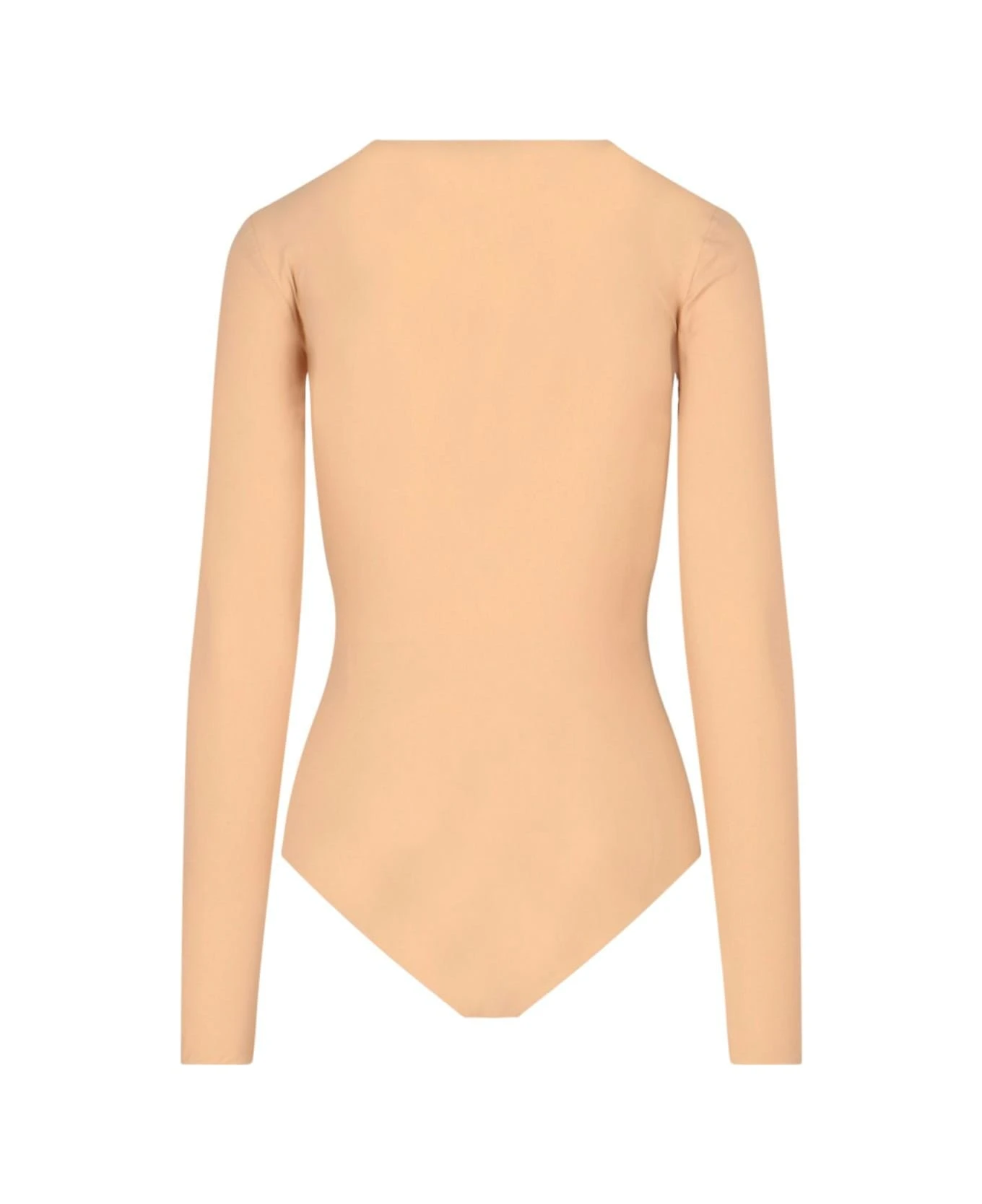 Maison Margiela MM6 Logo bodysuit in beige fabric, with round neckline, tone-on-tone numeric logo print at the front and a snap button closure.