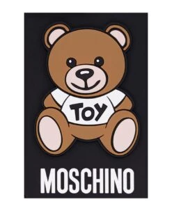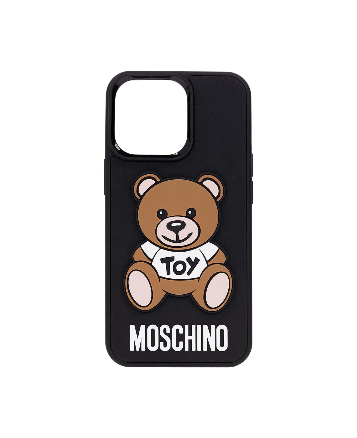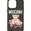 Black, brown and white iPhone 13 Pro case with the brand’s signature teddy and logo from Moschino.