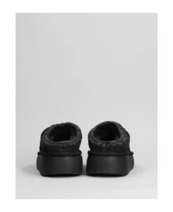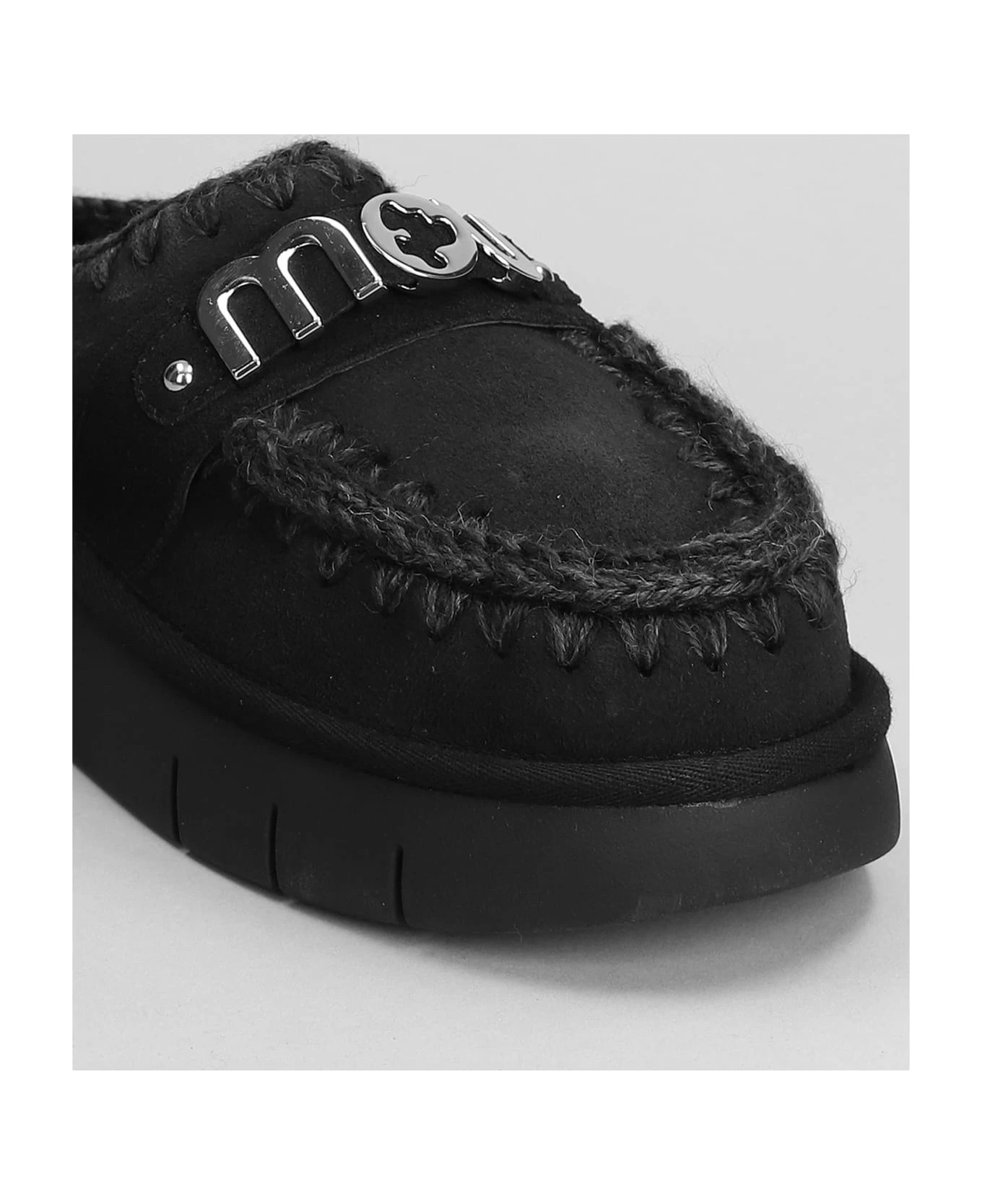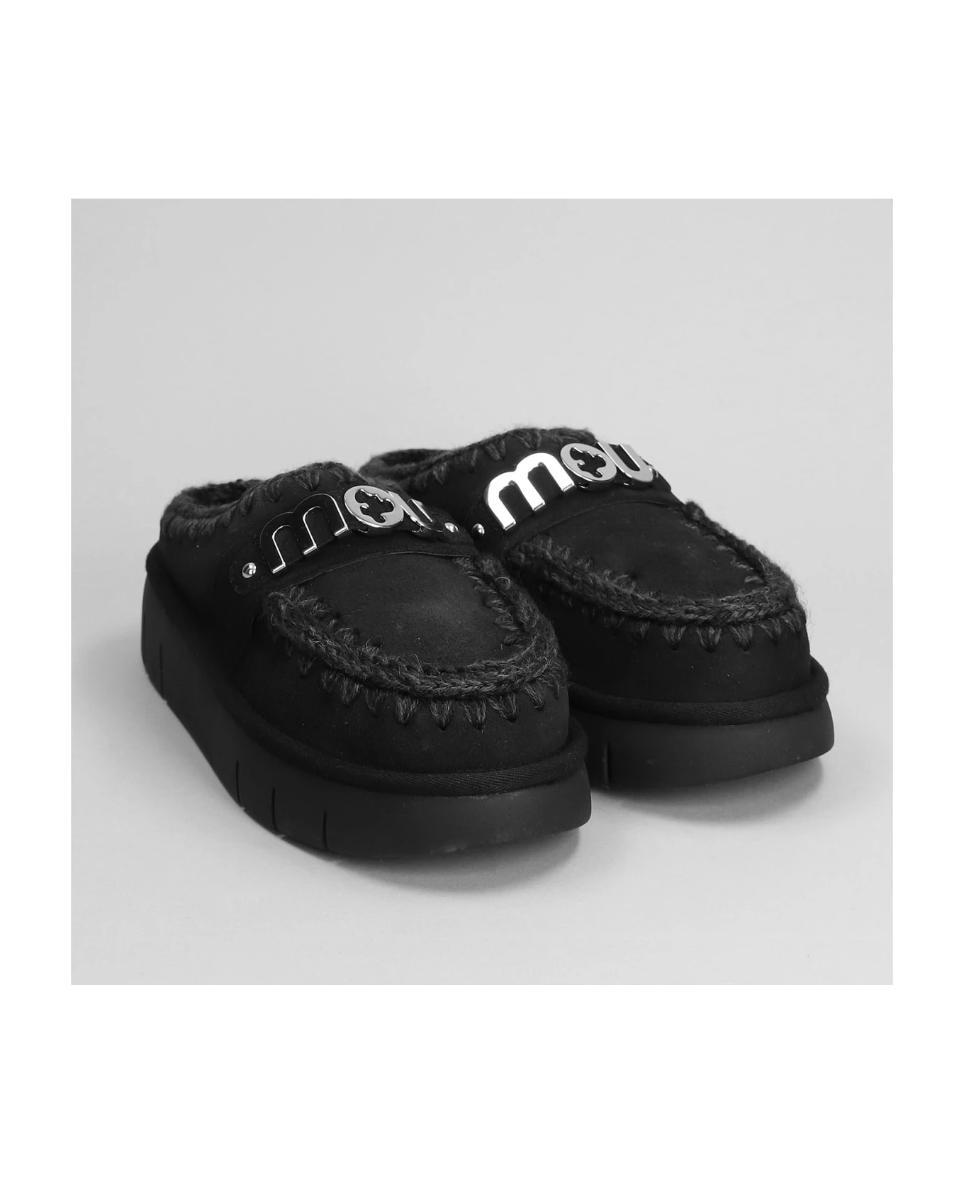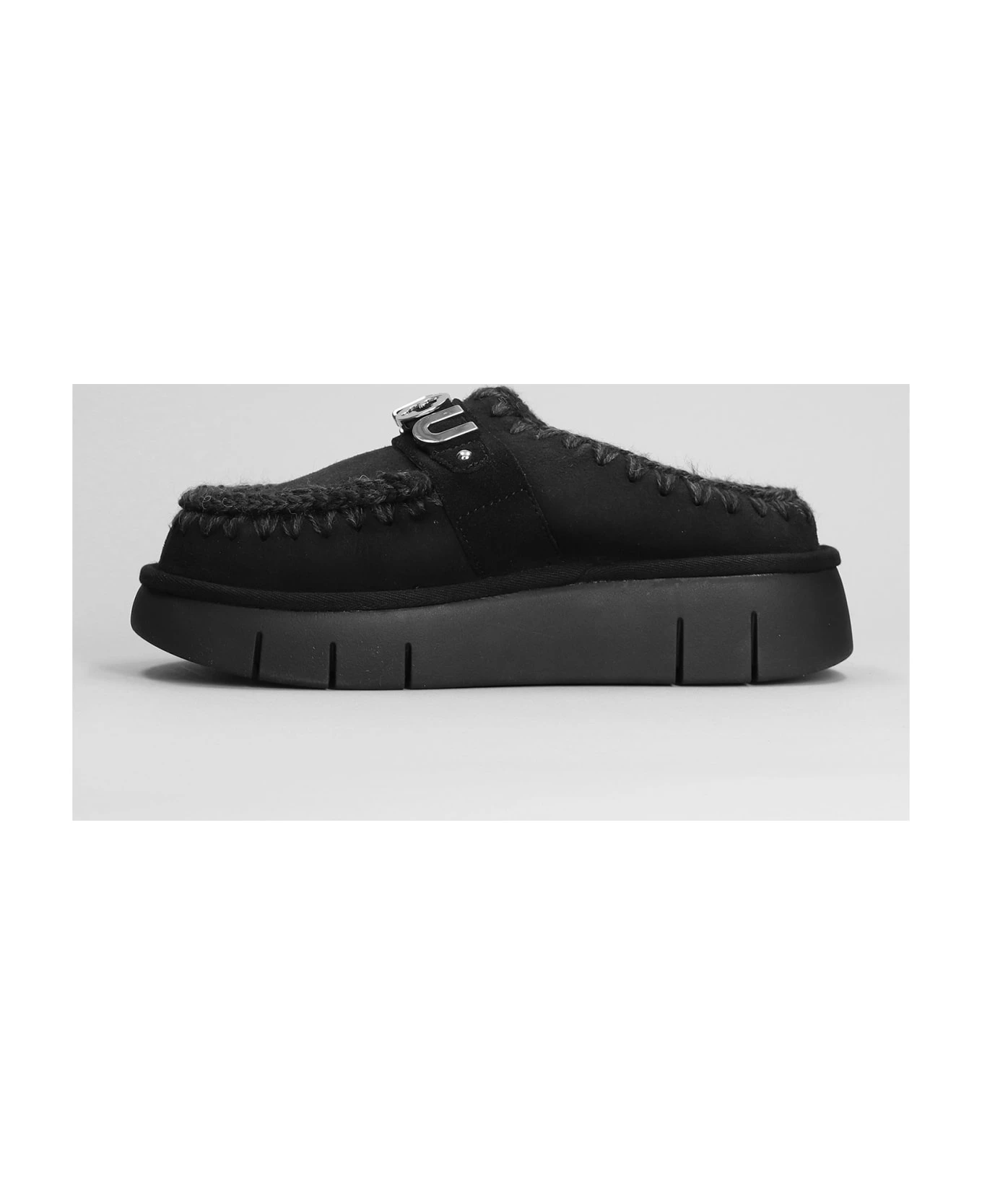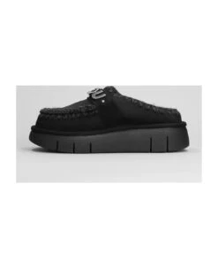Bounce clog Slipper-Mule in black suede, open back, shearling detail, metallic logo, gum traction treads, stitching detail, Made in China, 100% suede