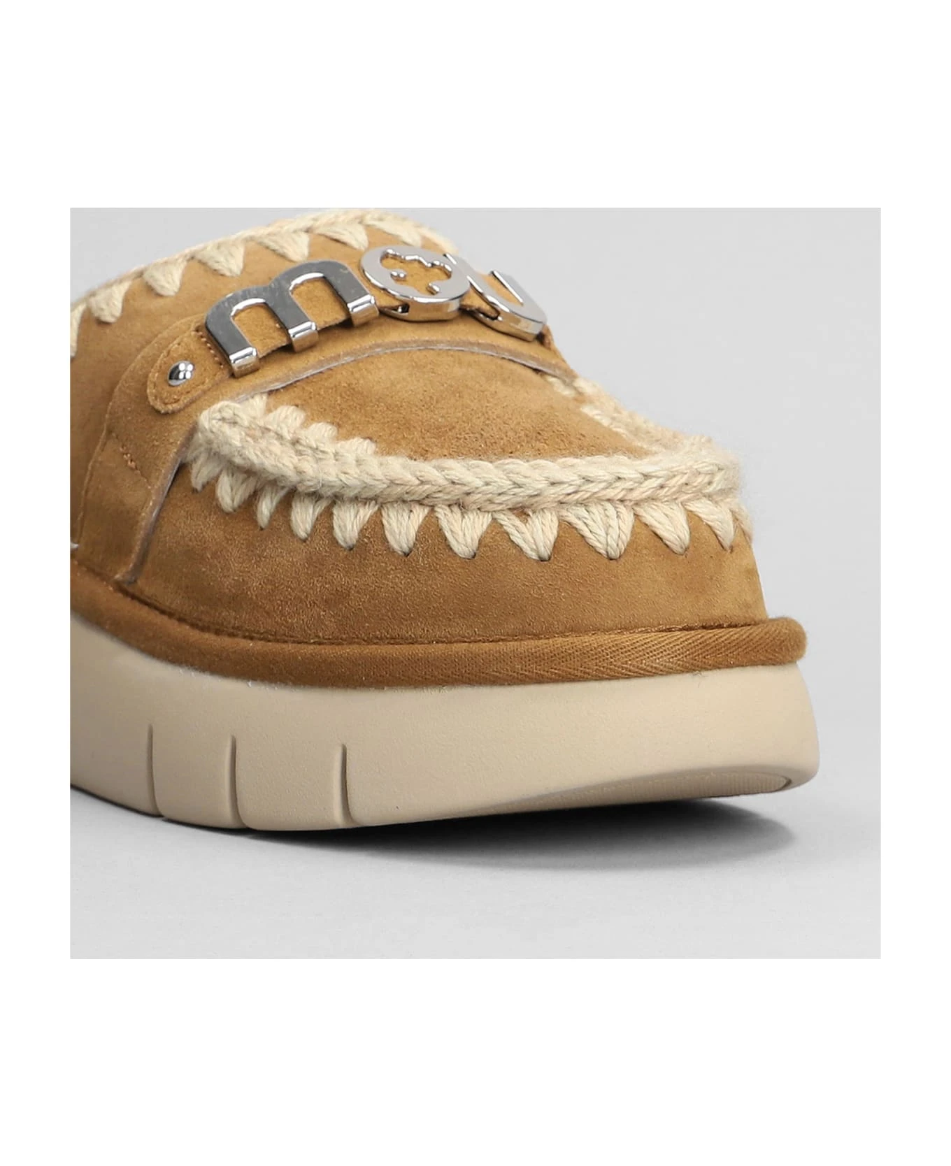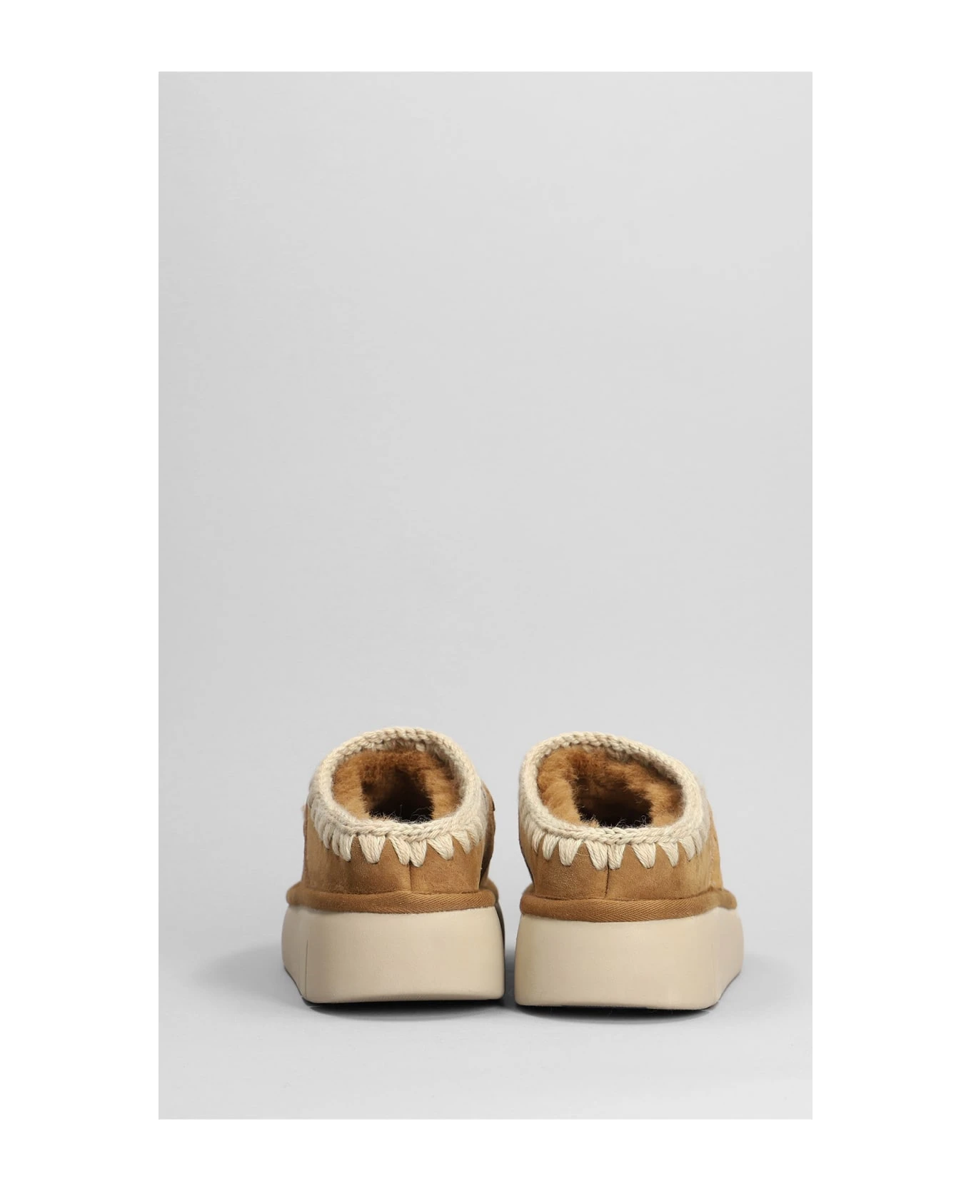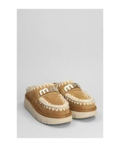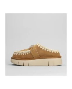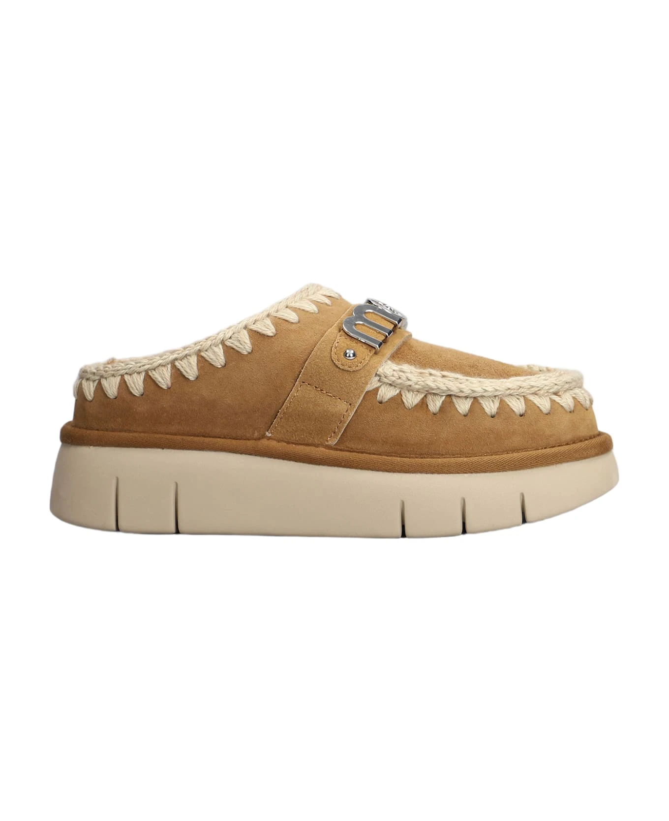 Bounce clog Slipper-Mule in brown suede, open back, shearling detail, metallic logo, gum traction treads, stitching detail, Made in China, 100% suede