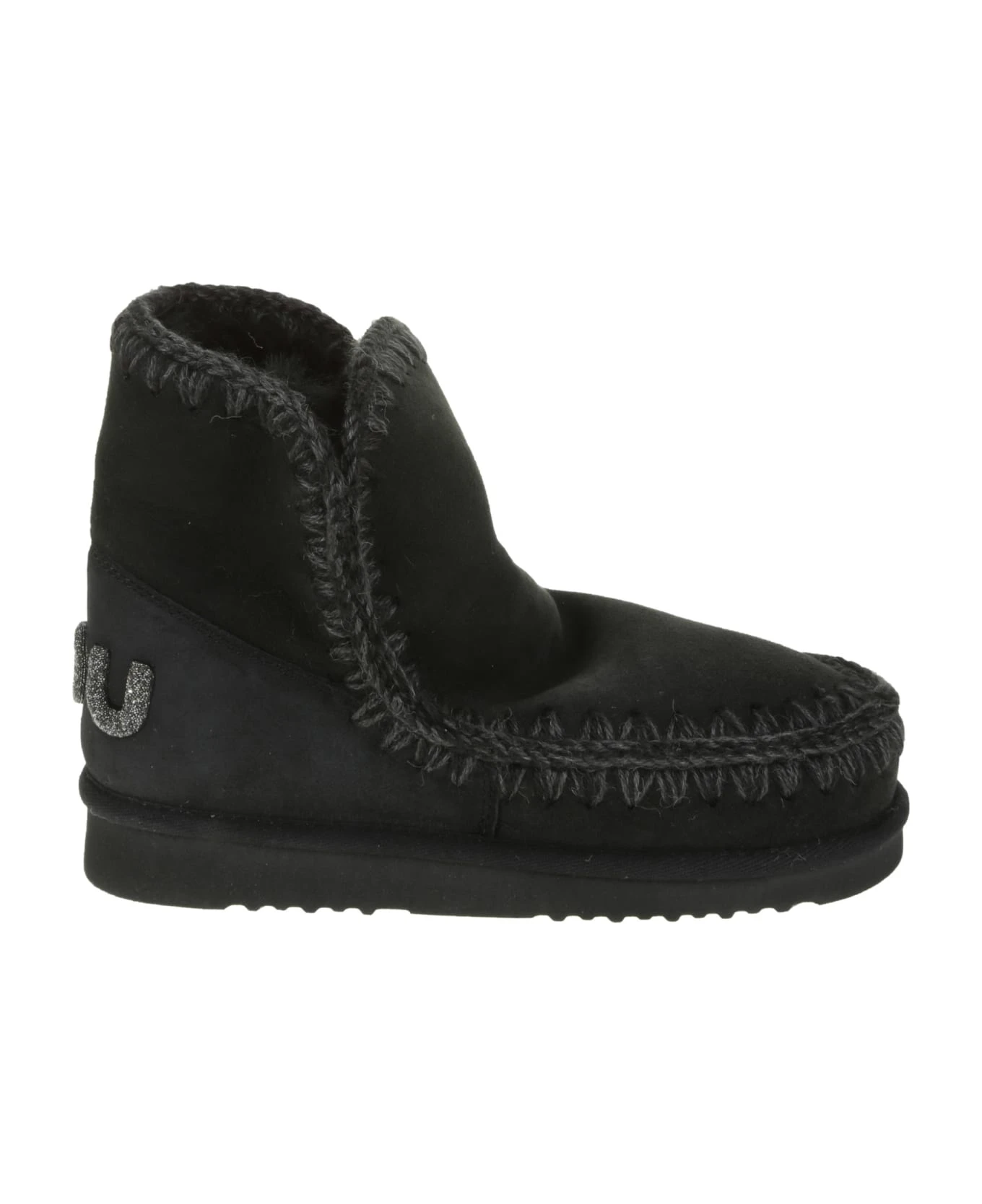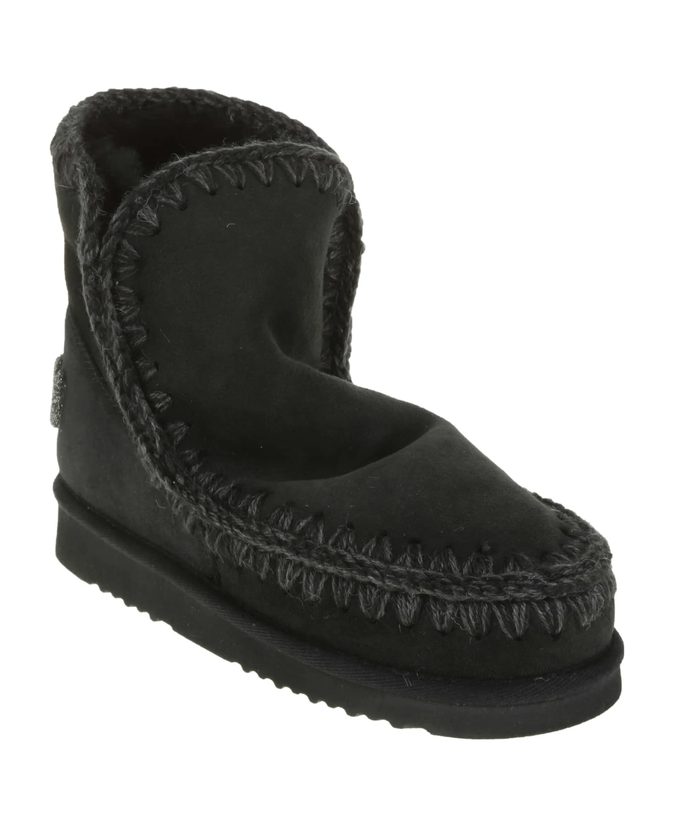 Mou Black suede boot, sheepskin interior, external stitching, glitter logo on the back, eva rubber sole.